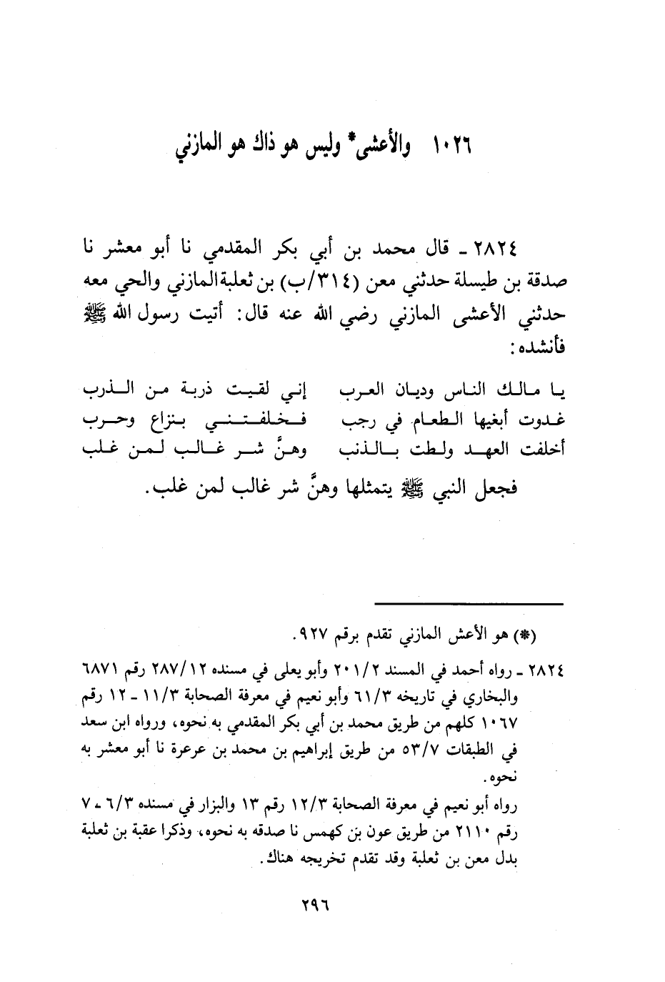 2824 - قَالَ مُحَمَّدُ بْنُ أَبِي بَكْرٍ الْمُقَدَّمِيُّ، نا أَبُو مَعْشَرٍ، نا صَدَقَةُ بْنُ طَيْسَلَةَ، حَدَّثَنِي مَعْنُ بْنُ ثَعْلَبَةَ الْمَازِنِيُّ، وَالْحَيُّ مَعَهُ، حَدَّثَنِي الْأَعْشَى الْمَازِنِيُّ، رَضِيَ اللَّهُ عَنْهُ قَالَ: أَتَيْتُ رَسُولَ اللَّهِ صَلَّى اللهُ عَلَيْهِ وَسَلَّمَ فَأَنْشَدَهُ: