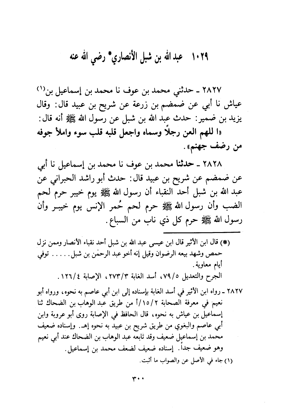 2827 - حَدَّثَنِي مُحَمَّدُ بْنُ عَوْفٍ، نا مُحَمَّدُ بْنُ إِسْمَاعِيلَ بْنِ عَيَّاشٍ، نا أَبِي، عَنْ ضَمْضَمِ بْنِ زُرْعَةَ، عَنْ شُرَيْحِ بْنِ عُبَيْدٍ قَالَ: وَقَالَ يَزِيدُ بْنُ ضُمَيْرٍ: حَدَّثَ عَبْدُ اللَّهِ بْنُ شِبْلٍ، عَنْ رَسُولِ اللَّهِ صَلَّى اللهُ عَلَيْهِ وَسَلَّمَ أَنَّهُ قَالَ: «اللَّهُمَّ §الْعَنْ رَجُلًا وَسَمَّاهُ وَاجْعَلْ قَلْبَهُ قَلْبَ سَوْءٍ وَامْلَأْ جَوْفَهُ مِنْ رَضْفِ جَهَنَّمَ»
