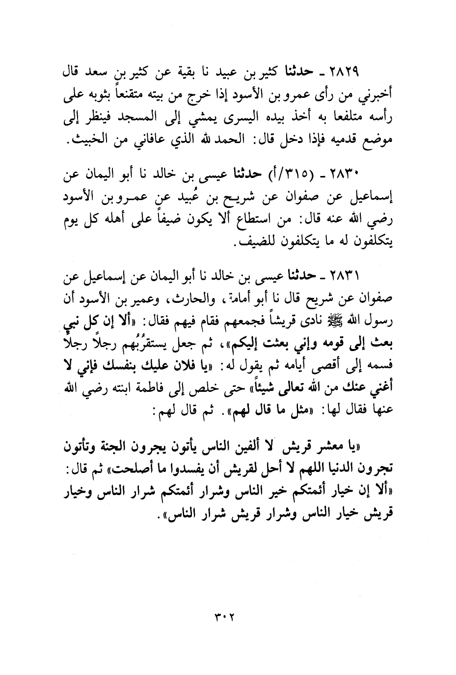 2831 - حَدَّثَنَا عِيسَى بْنُ خَالِدٍ، نا أَبُو الْيَمَانِ، عَنْ إِسْمَاعِيلَ، عَنْ صَفْوَانَ، عَنْ شُرَيْحٍ قَالَ: نا أَبُو أُمَامَةَ، وَالْحَارِثُ، وَعُمَيْرُ بْنُ الْأَسْوَدِ، أَنَّ رَسُولَ اللَّهِ صَلَّى اللهُ عَلَيْهِ وَسَلَّمَ نَادَى قُرَيْشًا فَجَمَعَهُمْ فَقَامَ فِيهِمْ فَقَالَ: «أَلَا إِنَّ §كُلَّ نَبِيٍّ بُعِثَ إِلَى قَوْمِهِ وَإِنِّي بُعِثْتُ إِلَيْكُمْ» ثُمَّ جَعَلَ يَسْتَقْرِبُهُمُ رَجُلًا رَجُلًا فَسُمُّهُ إِلَى أَقْصَى أَيَّامِهِ ثُمَّ يَقُولُ لَهُ: «يَا فُلَانُ عَلَيْكَ بِنَفْسِكَ فَإِنِّي لَا أُغْنِي عَنْكَ مِنَ اللَّهِ تَعَالَى شَيْئًا» حَتَّى خَلَصَ إِلَى فَاطِمَةَ ابْنَتِهِ رَضِيَ اللَّهُ عَنْهُا فَقَالَ لَهَا مِثْلَ مَا قَالَ لَهُمْ ثُمَّ قَالَ لَهُمْ: «يَا مَعْشَرَ قُرَيْشٍ، لَا أُلْفِيَنَّ النَّاسَ يَأَتُونَ يَجُرُّونَ الْجَنَّةَ وَتَأْتُونَ تَجُرُّونَ الدُّنْيَا، اللَّهُمَّ لَا أُحِلُّ لِقُرَيْشٍ أَنْ يُفْسِدُوا مَا أَصْلَحْتُ» ثُمَّ قَالَ: «أَلَا إِنَّ خِيَارَ أَئِمَّتِكُمْ خَيْرُ النَّاسِ وَشِرَارُ أَئِمَّتِكُمْ شِرَارُ النَّاسِ وَخِيَارُ قُرَيْشٍ خِيَارُ النَّاسِ وَشِرَارُ قُرَيْشٍ شِرَارُ النَّاسِ»