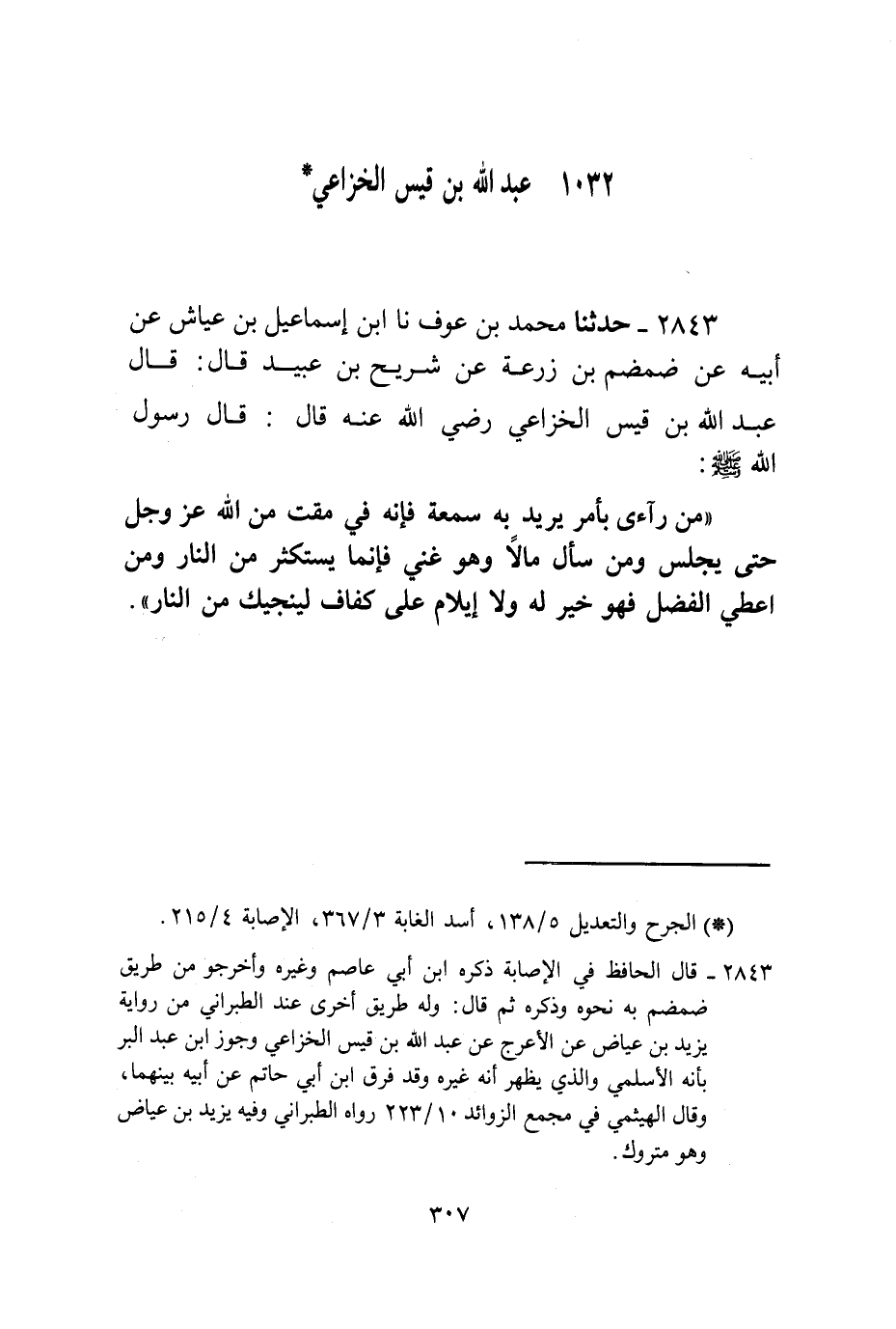 2843 - حَدَّثَنَا مُحَمَّدُ بْنُ عَوْفٍ، نا ابْنُ إِسْمَاعِيلَ بْنِ عَيَّاشٍ، عَنْ أَبِيهِ، عَنْ ضَمْضَمِ بْنِ زُرْعَةَ، عَنْ شُرَيْحِ بْنِ عُبَيْدٍ قَالَ: قَالَ عَبْدُ اللَّهِ بْنُ قَيْسٍ الْخُزَاعِيُّ رَضِيَ اللَّهُ عَنْهُ قَالَ: قَالَ رَسُولُ اللَّهِ صَلَّى اللهُ عَلَيْهِ وَسَلَّمَ: «§مَنْ رَآءَى بِأَمْرٍ يُرِيدُ بِهِ سُمْعَةً فَإِنَّه فِي مَقْتٍ مِنَ اللَّهِ عَزَّ وَجَلَّ حَتَّى يَجْلِسَ، وَمَنْ سَأَلَ مَالًا وَهُوَ غَنِيٌّ فَإِنَّمَا يَسْتَكْثِرُ مِنَ النَّارِ وَمَنْ أُعْطِيَ الْفَضْلَ فَهُوَ خَيْرٌ لَهُ وَلَا إِيلَامَ عَلَى كَفَافٍ لِيُنْجِيَكَ مِنَ النَّارِ»
