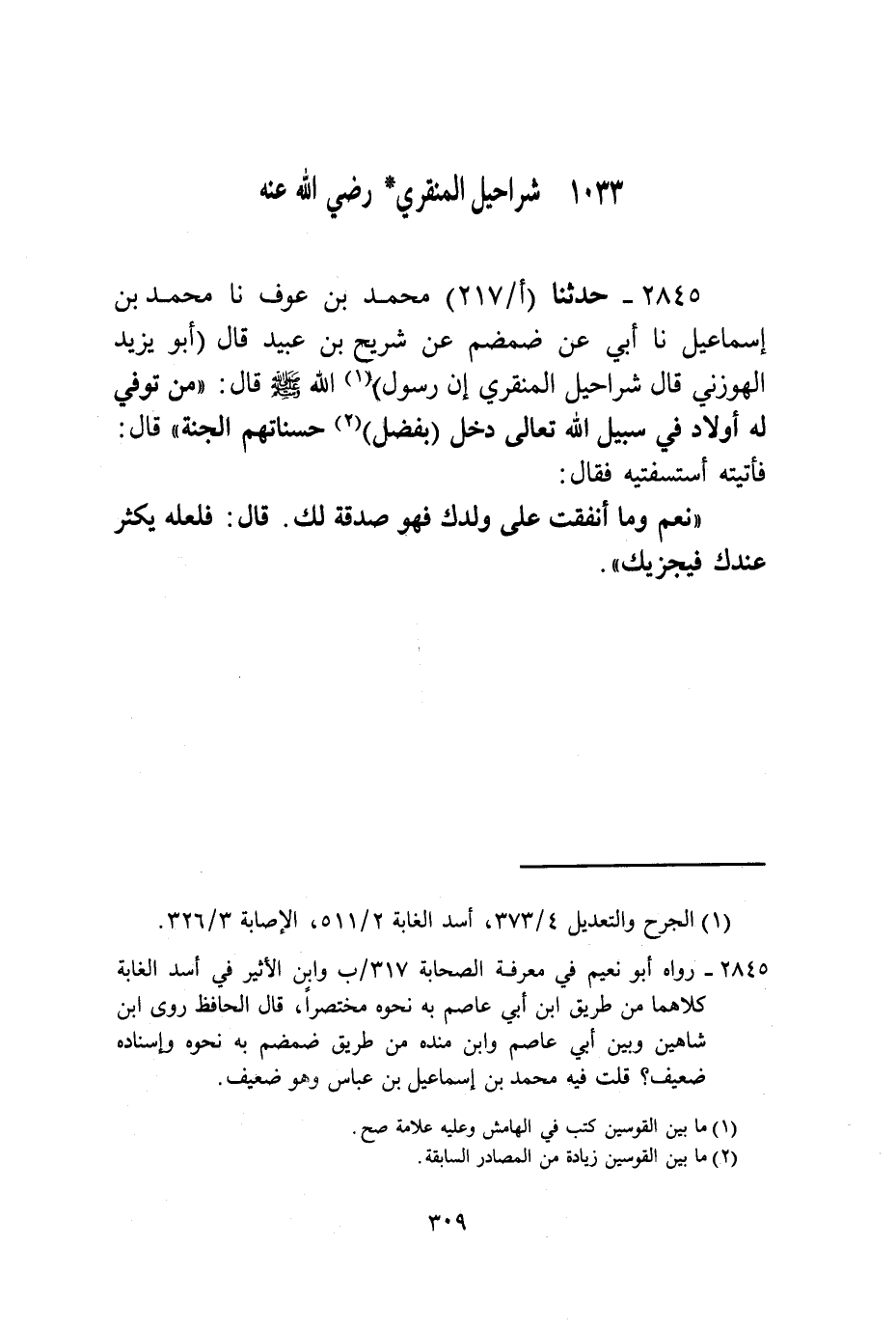 2845 - حَدَّثَنَا مُحَمَّدُ بْنُ عَوْفٍ، نا مُحَمَّدُ بْنُ إِسْمَاعِيلَ، نا أَبِي، عَنْ ضَمْضَمٍ، عَنْ شُرَيْحِ بْنِ عُبَيْدٍ قَالَ أَبُو يزَيْدَ الْهَوْزَنِيُّ: قَالَ شَرَاحِيلُ الْمِنْقَرِيُّ: إِنَّ رَسُولَ اللَّهِ صَلَّى اللهُ عَلَيْهِ وَسَلَّمَ قَالَ: «§مَنْ تُوُفِّيَ لَهُ أَوْلَادٌ فِي سَبِيلِ اللَّهِ تَعَالَى دَخَلَ بِفَضْلِ حَسَنَاتِهِمُ الْجَنَّةَ» قَالَ: فَأَتَيْتُهُ أَسْتَفْتِيهِ فَقَالَ: «نَعَمْ، وَمَا أَنْفَقْتَ عَلَى وَلَدِكَ فَهُوَ صَدَقَةٌ لَكَ» قَالَ: «فَلَعَلَّهُ يَكْثُرُ عِنْدَكَ فَيَجْزِيَكَ»
