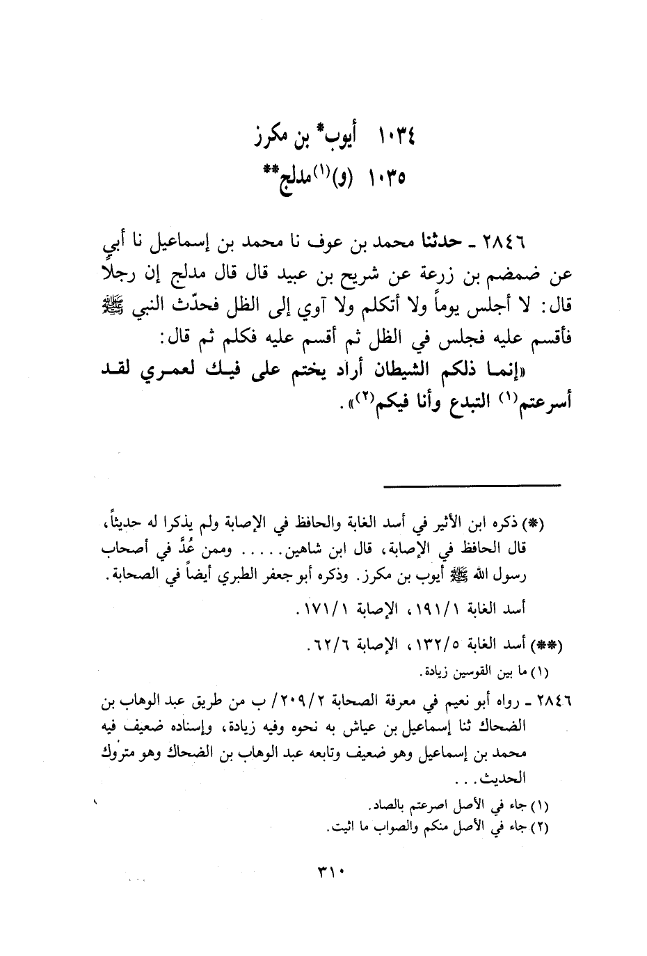2846 - حَدَّثَنَا مُحَمَّدُ بْنُ عَوْفٍ، نا مُحَمَّدُ بْنُ إِسْمَاعِيلَ، نا أَبِي، عَنْ ضَمْضَمِ بْنِ زُرْعَةَ، عَنْ شُرَيْحِ بْنِ عُبَيْدٍ قَالَ: قَالَ مُدْلِجٌ: إِنَّ رَجُلًا قَالَ: لَا أَجْلِسُ يَوْمًا وَلَا أَتَكَلَّمُ وَلَا آوِي إِلَى الظِّلِّ فَحُدِّثَ النَّبِيُّ صَلَّى اللهُ عَلَيْهِ وَسَلَّمَ فَأَقْسَمَ عَلَيْهِ فَجَلَسَ فِي الظِّلِّ ثُمَّ أَقْسَمَ عَلَيْهِ فَكَلَّمَ ثُمَّ قَالَ: «إِنَّمَا §ذَلِكُمُ الشَّيْطَانُ أَرَادَ يَخْتِمُ عَلَى فِيكَ لَعَمْرِي لَقَدْ أَسْرَعْتُمُ التَّبَدُّعَ وَأَنَا فِيكُمْ»