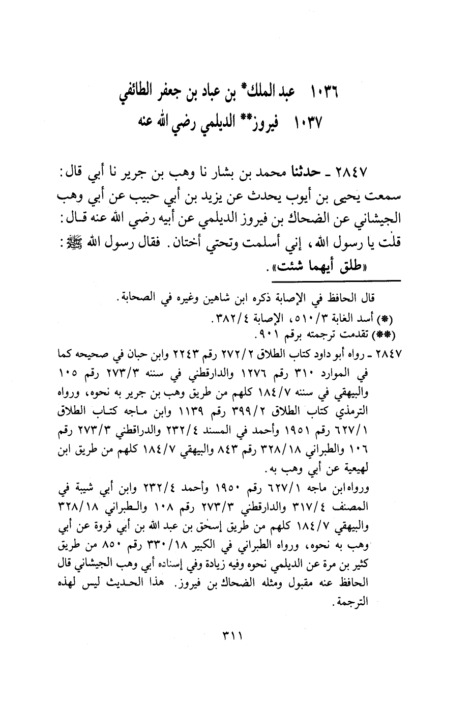 2847 - حَدَّثَنَا مُحَمَّدُ بْنُ بَشَّارٍ، نا وَهْبُ بْنُ جَرِيرٍ، نا أَبِي قَالَ: سَمِعْتُ يَحْيَى بْنَ أَيُّوبَ، يُحَدِّثُ عَنْ يَزِيدَ بْنِ أَبِي حَبِيبٍ، عَنْ أَبِي وَهْبٍ الْجَيْشَانِيِّ، عَنِ الضَّحَّاكِ بْنِ فَيْرُوزٍ الدَّيْلَمِيِّ، عَنْ أَبِيهِ، رَضِيَ اللَّهُ عَنْهُ قَالَ: قُلْتُ: يَا رَسُولَ اللَّهِ، إِنِّي أَسْلَمْتُ وَتَحْتِي أُخْتَانِ. فَقَالَ رَسُولُ اللَّهِ صَلَّى اللهُ عَلَيْهِ وَسَلَّمَ: «§طَلِّقْ أَيُّهُمَا شِئْتَ»