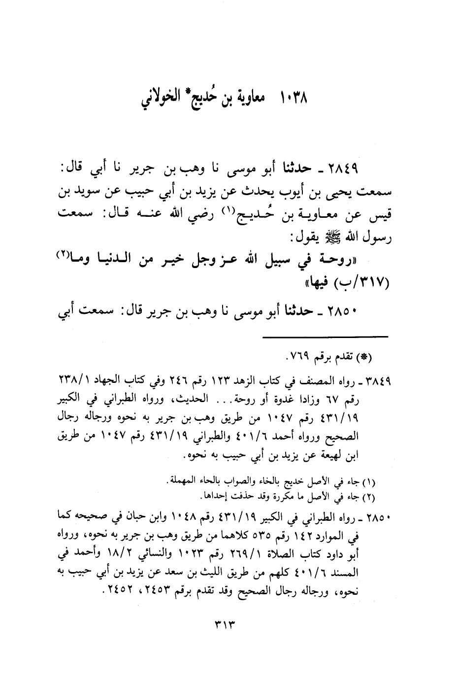 2849 - حَدَّثَنَا أَبُو مُوسَى، نا وَهْبُ بْنُ جَرِيرٍ، نا أَبِي قَالَ: سَمِعْتُ يَحْيَى بْنَ أَيُّوبَ، يُحَدِّثُ، عَنْ يَزِيدَ بْنِ أَبِي حَبِيبٍ، عَنْ سُوَيْدِ بْنِ قَيْسٍ، عَنْ مُعَاوِيَةَ بْنِ حَدِيجٍ، رَضِيَ اللَّهُ عَنْهُ قَالَ: سَمِعْتُ رَسُولَ اللَّهِ صَلَّى اللهُ عَلَيْهِ وَسَلَّمَ يَقُولُ: «§رَوْحَةٌ فِي سَبِيلِ اللَّهِ عَزَّ وَجَلَّ خَيْرٌ مِنَ الدُّنْيَا وَمَا فِيهَا»