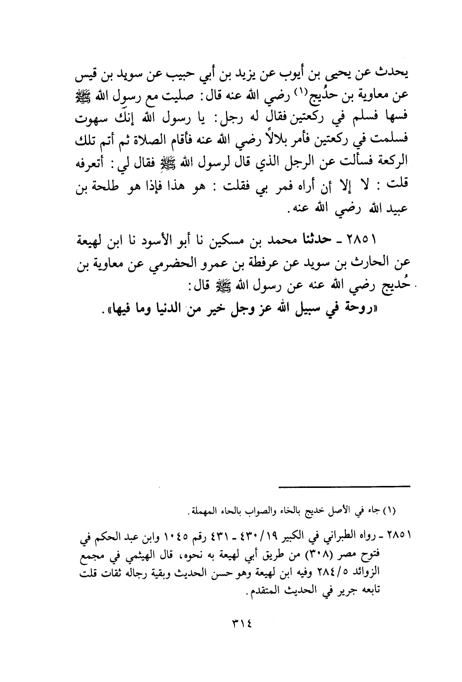 2851 - حَدَّثَنَا مُحَمَّدُ بْنُ مِسْكِينٍ، نا أَبُو الْأَسْوَدِ، نا ابْنُ لَهِيعَةَ، عَنِ الْحَارِثِ بْنِ سُوَيْدٍ، عَنْ عُرْفُطَةَ بْنِ عَمْرٍو الْحَضْرَمِيِّ، عَنْ مُعَاوِيَةَ بْنِ حُدَيْجٍ، رَضِيَ اللَّهُ عَنْهُ، عَنْ رَسُولِ اللَّهِ صَلَّى اللهُ عَلَيْهِ وَسَلَّمَ قَالَ: «§رَوْحَةٌ فِي سَبِيلِ اللَّهِ عَزَّ وَجَلَّ خَيْرٌ مِنَ الدُّنْيَا وَمَا فِيهَا»