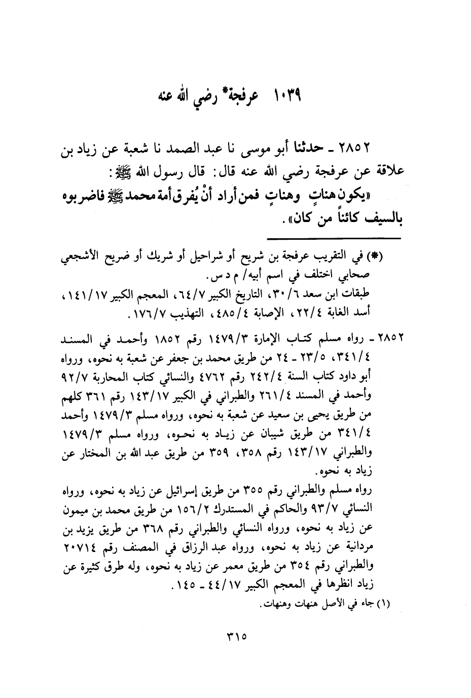 2852 - حَدَّثَنَا أَبُو مُوسَى، نا عَبْدُ الصَّمَدِ، نا شُعْبَةُ، عَنْ زِيَادِ بْنِ عِلَاقَةَ، عَنْ عَرْفَجَةَ، رَضِيَ اللَّهُ عَنْهُ قَالَ: قَالَ رَسُولُ اللَّهِ صَلَّى اللهُ عَلَيْهِ وَسَلَّمَ: «يَكُونُ هَنَاتٌ وَهَنَاتٌ §فَمَنْ أَرَادَ أَنَّ يُفَرِّقَ أُمَّةَ مُحَمَّدٍ صَلَّى اللهُ عَلَيْهِ وَسَلَّمَ فَاضْرِبُوهُ بِالسَّيْفِ كَائِنًا مَنْ كَانَ»