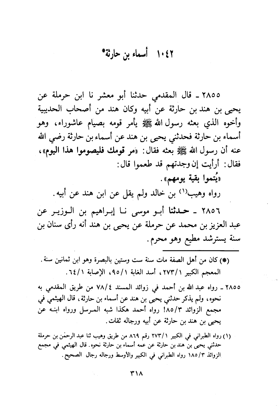 2855 - قَالَ الْمُقَدَّمِيُّ: حَدَّثَنَا أَبُو مَعْشَرٍ، نا ابْنُ حَرْمَلَةَ، عَنْ يَحْيَى بْنِ هِنْدَ بْنِ حَارِثَةَ، عَنْ أَبِيهِ، وَكَانَ هِنْدٌ مِنْ أَصْحَابِ الْحُدَيْبِيَةِ وَأَخُوهُ الَّذِي بَعَثَهُ رَسُولُ اللَّهِ صَلَّى اللهُ عَلَيْهِ وَسَلَّمَ يَأْمُرُ قَوْمَهُ بِصِيَامِ عَاشُورَاءَ وَهُوَ أَسْمَاءُ بْنُ حَارِثَةَ فَحَدَّثَنِي يَحْيَى بْنُ هِنْدَ، عَنْ أَسْمَاءَ بْنِ حَارِثَةَ رَضِيَ اللَّهُ عَنْهُ أَنَّ رَسُولَ اللَّهِ صَلَّى اللهُ عَلَيْهِ وَسَلَّمَ بَعَثَهُ فَقَالَ: «§مُرْ قَوْمَكَ فَلْيَصُومُوا هَذَا الْيَوْمَ» فَقَالَ: أَرَأَيْتَ إِنْ وَجَدْتُهمْ قَدْ طَعِمُوا قَالَ: «يُتِمُّوا بَقِيَّةَ يَوْمِهِمْ» رَوَاهُ وُهَيْبُ بْنُ خَالِدٍ، وَلَمْ يَقُلْ: عَنِ ابْنِ هِنْدَ، عَنْ أَبِيهِ