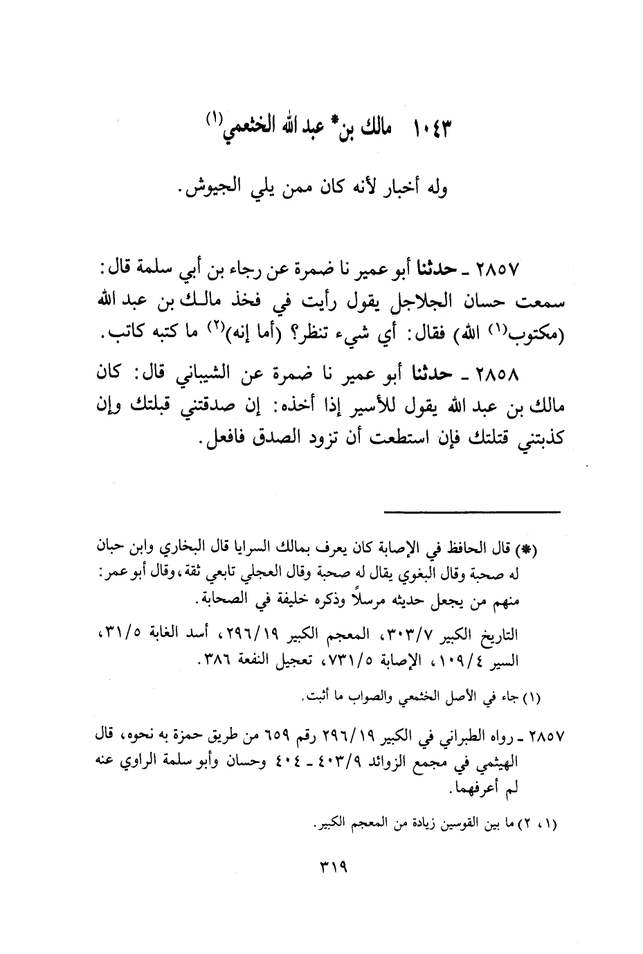 2858 - حَدَّثَنَا أَبُو عُمَيْرٍ، نا ضَمْرَةُ، عَنِ الشَّيْبَانِيِّ قَالَ: كَانَ مَالِكُ بْنُ عَبْدِ اللَّهِ يَقُولُ لِلْأَسِيرِ إِذَا أَخَذَهُ: " §إِنْ صَدَقْتَنِي قَبِلْتُكَ وَإِنْ كَذَبْتَنِي قَتَلْتُكَ فَإِنِ اسْتَطَعْتَ أَنْ تُزَوَّدَ الصِّدْقَ فَافْعَلْ