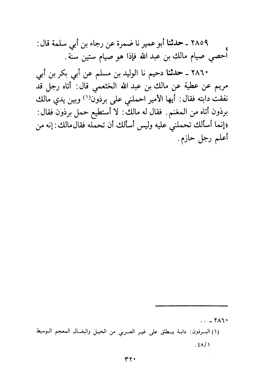 2860 - حَدَّثَنَا دُحَيْمٌ، نا الْوَلِيدُ بْنُ مُسْلِمٍ، عَنْ أَبِي بَكْرِ بْنِ أَبِي مَرْيَمَ، عَنْ عَطِيَّةَ، عَنْ مَالِكِ بْنِ عَبْدِ اللَّهِ الْخَثْعَمِيِّ قَالَ: أَتَاهُ رَجُلٌ قَدْ نَفَقَتْ دَابَّتُهُ فَقَالَ: أَيُّهَا الْأَمِيرُ §احْمِلْنِي عَلَى بِرْذَوْنٍ، وَبَيْنَ يَدَيْ مَالِكٍ بِرْذَوْنٌ أَتَاهُ مِنَ الْمَغْنَمِ فَقَالَ لَهُ مَالِكٌ: لَا أَسْتَطِيعُ حِمْلَ بِرْذَوْنٍ فَقَالَ: إِنَّمَا أَسْأَلُكَ تَحْمِلُنِي عَلَيْهِ وَلَيْسَ أَسْأَلُكَ أَنْ تَحْمِلَهُ. فَقَالَ مَالِكٌ: إِنَّهُ مَنْ أَعْلَمُ رَجُلٌ حَازِمٌ