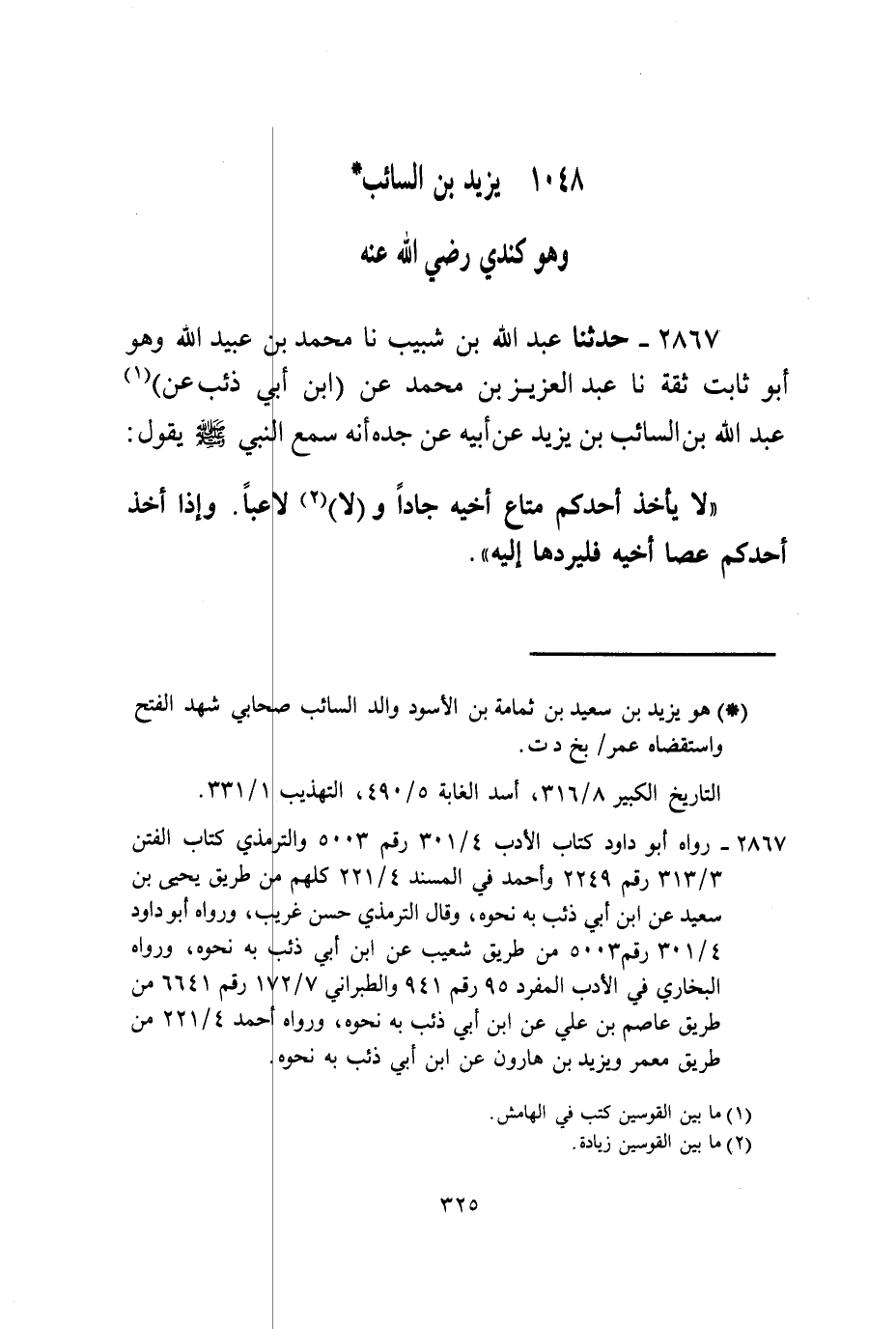 2867 - حَدَّثَنَا عَبْدُ اللَّهِ بْنُ شَبِيبٍ، نا مُحَمَّدُ بْنُ عُبَيْدِ اللَّهِ وَهُوَ أَبُو ثَابِتٍ ثِقَةٌ، نا عَبْدُ الْعَزِيزِ بْنُ مُحَمَّدٍ، عَنِ ابْنِ أَبِي ذِئْبٍ، عَنْ عَبْدِ اللَّهِ بْنِ السَّائِبِ بْنِ يَزِيدَ، عَنْ أَبِيهِ، عَنْ جَدِّهِ، انْهَ سَمِعَ النَّبِيَّ صَلَّى اللهُ عَلَيْهِ وَسَلَّمَ يَقُولُ: «§لَا يَأْخُذْ أَحَدُكُمْ مَتَاعَ أَخِيهِ جَادًّا وَلَا لَاعِبًا، وَإِذَا أَخَذَ أَحَدُكُمْ عَصَا أَخِيهِ فَلْيَرُدَّهَا إِلَيْهِ»