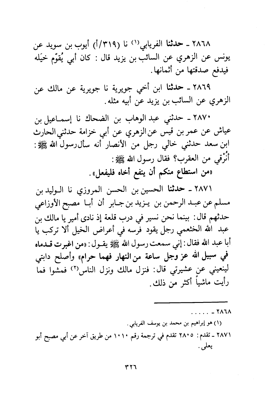 2871 - حَدَّثَنَا الْحُسَيْنُ بْنُ الْحَسَنِ الْمَرْوَزِيُّ، نا الْوَلِيدُ بْنُ مُسْلِمٍ، عَنْ عَبْدِ الرَّحْمَنِ بْنِ يَزِيدَ بْنِ جَابِرٍ، أَنَّ أَبَا مُصَبَّحٍ الْأَوْزَاعِيَّ، حَدَّثَهُمْ قَالَ: بَيْنَمَا نَحْنُ نَسِيرُ فِي دَرْبِ قَلْعَةٍ إِذْ نَادَى أَمِيرٌ: يَا مَالِكُ بْنَ عَبْدِ اللَّهِ الْخَثْعَمِيُّ رَجُلٌ يَقُودُ فَرَسَهُ فِي أَعْرَاضِ الْخَيْلِ أَلَا تَرْكَبُ يَا أَبَا عَبْدِ اللَّهِ؟ فَقَالَ: إِنِّي سَمِعْتُ رَسُولَ اللَّهِ صَلَّى اللهُ عَلَيْهِ وَسَلَّمَ يَقُولُ: «§مَنِ اغْبَرَّتْ قَدَمَاهُ فِي سَبِيلِ اللَّهِ عَزَّ وَجَلَّ سَاعَةً مِنَ النَّهَارِ فَهُمَا حَرَامٌ» وَأُصْلِحُ دَابَّتِي لِيَنْعِيَنِي عَنْ عَشِيرَتِي قَالَ: فَنَزَلَ مَالِكٌ وَنَزَلَ النَّاسُ فَمَشَوْا فَمَا رَأَيْتُ مَاشِيًا أَكْثَرَ مِنْ ذَلِكَ