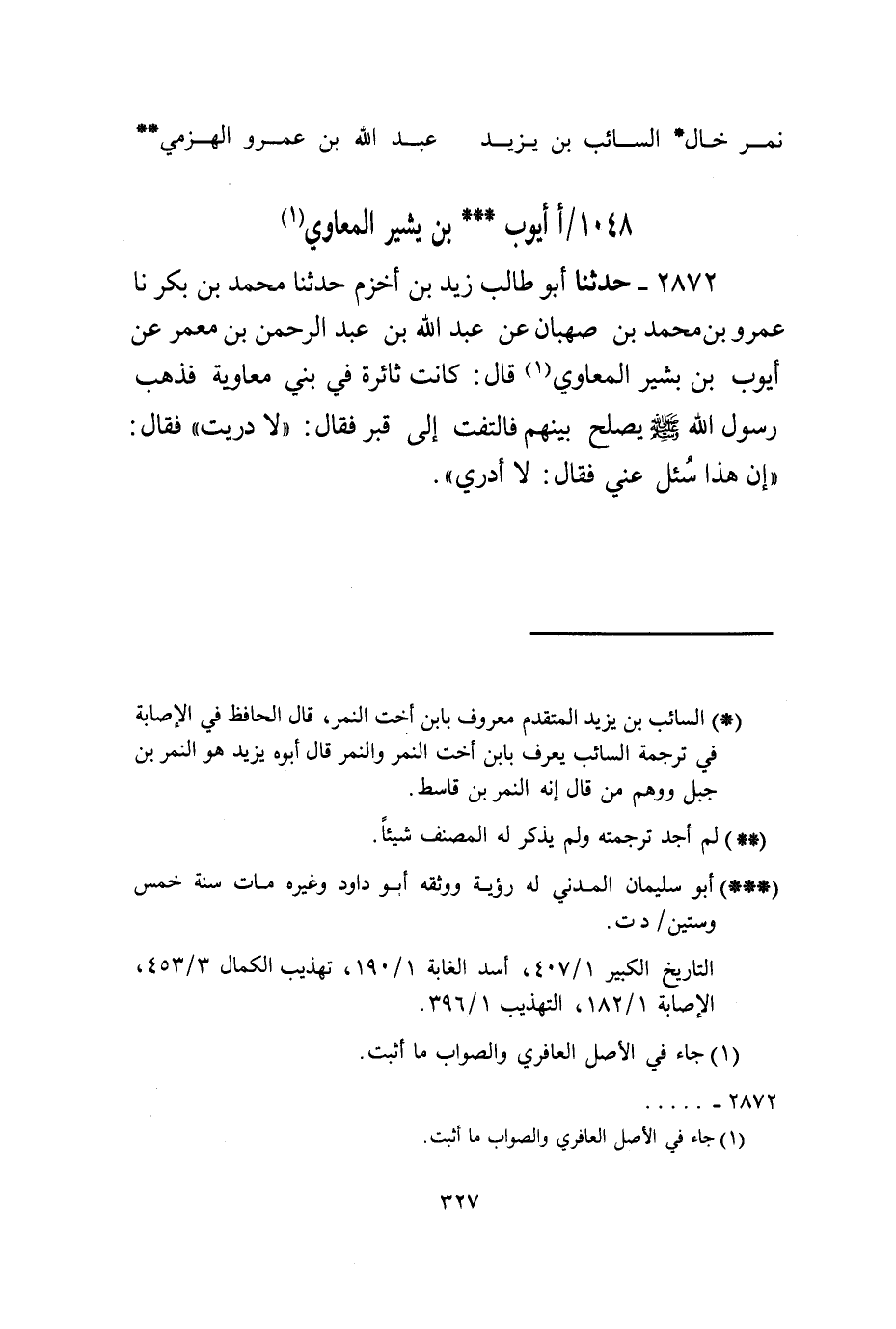 2872 - حَدَّثَنَا أَبُو طَالِبٍ زَيْدُ بْنُ أَخْزَمَ، حَدَّثَنَا مُحَمَّدُ بْنُ بَكْرٍ، نا عَمْرُو بْنُ مُحَمَّدِ بْنِ صُهْبَانَ، عَنْ عَبْدِ اللَّهِ بْنِ عَبْدِ الرَّحْمَنِ بْنِ مَعْمَرٍ، عَنْ أَيُّوبَ بْنِ بَشِيرٍ الْمُعَاوِيِّ قَالَ: كَانَتْ ثَائِرَةٌ فِي بَنِي مُعَاوِيَةَ، فَذَهَبَ رَسُولُ اللَّهِ صَلَّى اللهُ عَلَيْهِ وَسَلَّمَ يُصْلِحُ بَيْنَهُمْ، فَالْتَفَتَ إِلَى قَبْرٍ فَقَالَ: «§لَا دَرَيْتَ» فَقَالَ: " إِنَّ هَذَا سُئِلَ عَنِّي فَقَالَ: لَا أَدْرِي "