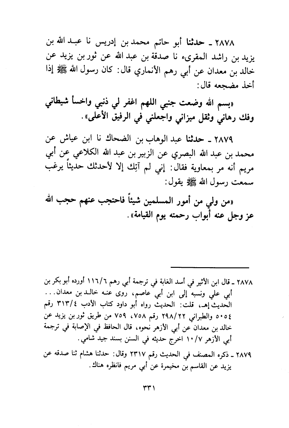 2879 - حَدَّثَنَا عَبْدُ الْوَهَّابِ بْنُ الضَّحَّاكِ، نا ابْنُ عَيَّاشٍ، عَنْ مُحَمَّدِ بْنِ عَبْدِ اللَّهِ الْبَصْرِيِّ، عَنِ الزُّبَيْرِ بْنِ عَبْدِ اللَّهِ الْكَلَاعِيِّ، عَنْ أَبِي مَرْيَمَ، أَنَّهُ مَرَّ بِمُعَاوِيَةَ فَقَالَ: إِنِّي لَمْ آتِكَ إِلَّا لَأُحَدِّثَكَ حَدِيثًا يُرَغِّبُ، سَمِعْتُ رَسُولَ اللَّهِ صَلَّى اللهُ عَلَيْهِ وَسَلَّمَ يَقُولُ: «§مَنْ وَلِيَ مِنْ أُمُورِ الْمُسْلِمِينَ شَيْئًا فَاحْتَجَبَ عَنْهُمْ حَجَبَ اللَّهُ عَزَّ وَجَلَّ عَنْهُ أَبْوَابَ رَحْمَتِهِ يَوْمَ الْقِيَامَةِ»