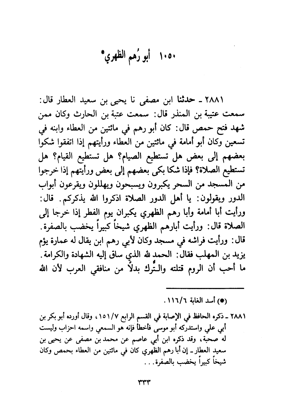 2881 - حَدَّثَنَا ابْنُ مُصَفًّى، نا يَحْيَى بْنُ سَعِيدٍ الْعَطَّارُ قَالَ: سَمِعْتُ عُتَيْبَةَ بْنَ الْمُنْذِرِ قَالَ: سَمِعْتُ عُتْبَةَ بْنَ الْحَارِثِ، وَكَانَ مِمَّنْ شَهِدَ فَتْحَ حِمْصَ قَالَ: كَانَ أَبُو رُهْمٍ فِي مِائَتَيْنِ مِنَ الْعَطَاءِ وَابْنُهُ فِي تِسْعِينَ، وَكَانَ أَبُو أُمَامَةَ فِي مِائَتَيْنِ مِنَ الْعَطَاءِ وَرَأَيْتُهُمْ §إِذَا اتَّفَقُوا شَكَوْا بَعْضَهُمْ إِلَى بَعْضِ هَلْ تَسْتَطِيعُ الصِّيَامَ؟ هَلْ تَسْتَطِيعُ الْقِيَامَ؟ هَلْ تَسْتَطِيعُ الصَّلَاةَ؟ فَإِذَا شَكَا بَكَى بَعْضُهُمْ إِلَى بَعْضٍ وَرَأَيْتُهُمْ إِذَا خَرَجُوا مِنَ الْمَسْجِدِ مِنَ السَّحَرِ يُكَبِّرُونَ وَيُسَبِّحُونَ وَيُهَلِّلُونَ وَيَقْرَعُونَ أَبْوَابَ الدُّورِ وَيَقُولُونَ: يَا أَهْلَ الدُّورِ، الصَّلَاةَ، اذْكُرُوا اللَّهَ يَذْكُرْكُمْ. قَالَ: وَرَأَيْتُ أَبَا أُمَامَةَ وَأَبَا رُهْمٍ الظِّهْرِيُّ يُكَبِّرَانِ يَوْمَ الْفِطْرِ إِذَا خَرَجَا إِلَى الصَّلَاةِ قَالَ: وَرَأَيْتُ أَبَا رُهْمُ الظِّهْرِيَّ شَيْخًا كَبِيرًا يَخْضِبُ بِالصُّفْرَةِ قَالَ: وَرَأَيْتُ فِرَاشِهِ فِي مَسْجِدٍ وَكَانَ لِأَبِي رُهْمٍ ابْنٌ يُقَالُ لَهُ: عُمَارَةُ يَؤُمُّ يَزِيدَ بْنَ الْمُهَلَّبِ فَقَالَ: الْحَمْدُ لِلَّهِ الَّذِي سَاقَ إِلَيْهِ الشَّهَادَةَ وَالْكَرَامَةَ مَا أُحِبُّ أَنَّ الرُّومَ قَتَلَتْهُ وَالتُّرْكُ بَدَلًا مِنْ مُنَافِقِي الْعَرَبِ لِأَنَّ اللَّهَ عَزَّ وَجَلَّ يَقُولُ: {يَا أَيُّهَا النَّبِيُّ جَاهَدِ الْكُفَّارَ وَالْمُنَافِقِينَ} [التوبة: 73] فَمَنْ خَرَجَ مِنْ جَمَاعَةِ الْمُسْلِمِينَ فَقَدْ خَلَعَ رِبْقَةَ الْإِسْلَامِ عَنْ عُنُقِهِ قَالَ: وَرَأَيْتُ عَلَى أَبِي أُمَامَةَ وَأَبِي رُهْمٍ قَلَانِسَ بَيْضَاءَ صِغَارًا قَالَ: وَرَأَيْتُ أَبَا رُهْمٍ وَأَبَا أُنَيْسٍ يَكْتَحِلَانِ قَالَ: وَرَأَيْتُهُمَا يَجِيئَانِ إِلَى الْمَسْجِدِ فَيَجْلِسُ أَحَدُهُمَا حَيْثُ يَنْتَهِي إِلَّا أَنْ يَرَى بَيْنَ يَدَيْهِ خَلَلًا فَيَقْدِمَ وَمَا يَدُلُّ عَلَى صَحَابَةِ نَبِيِّنَا صَلَّى اللهُ عَلَيْهِ وَسَلَّمَ وَكَثْرَةِ الرَّاوِينَ عَنْهُمْ