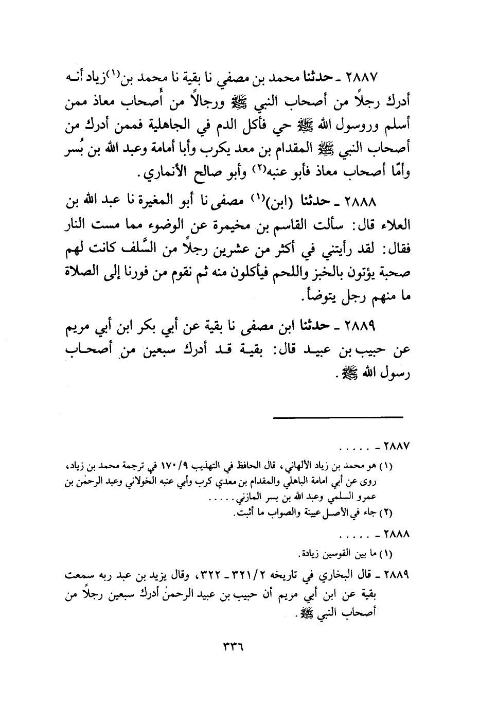 2887 - حَدَّثَنَا مُحَمَّدُ بْنُ مُصَفًّى، نا بَقِيَّةُ، نا مُحَمَّدُ بْنُ زِيَادٍ، أَنَّهُ §أَدْرَكَ رَجُلًا مِنْ أَصْحَابِ النَّبِيِّ صَلَّى اللهُ عَلَيْهِ وَسَلَّمَ وَرِجَالًا مِنْ أَصْحَابِ مُعَاذٍ مِمَّنْ أَسْلَمَ وَرَسُولُ اللَّهِ صَلَّى اللهُ عَلَيْهِ وَسَلَّمَ حَيٌّ فَأَكَلَ الدَّمَ فِي الْجَاهِلِيَّةِ فَمِمَّنْ أَدْرَكَ مِنْ أَصْحَابِ النَّبِيِّ صَلَّى اللهُ عَلَيْهِ وَسَلَّمَ الْمِقْدَامُ بْنُ مَعْدِ يكَرِبَ وَأَبَوْ أُمَامَةَ وَعَبْدُ اللَّهِ بْنُ بُسْرٍ، وَأَمَّا أَصْحَابُ مُعَاذٍ، فَأَبُو عِنَبَةَ وَأَبُو صَالِحٍ الْأَنْمَارِيُّ "
