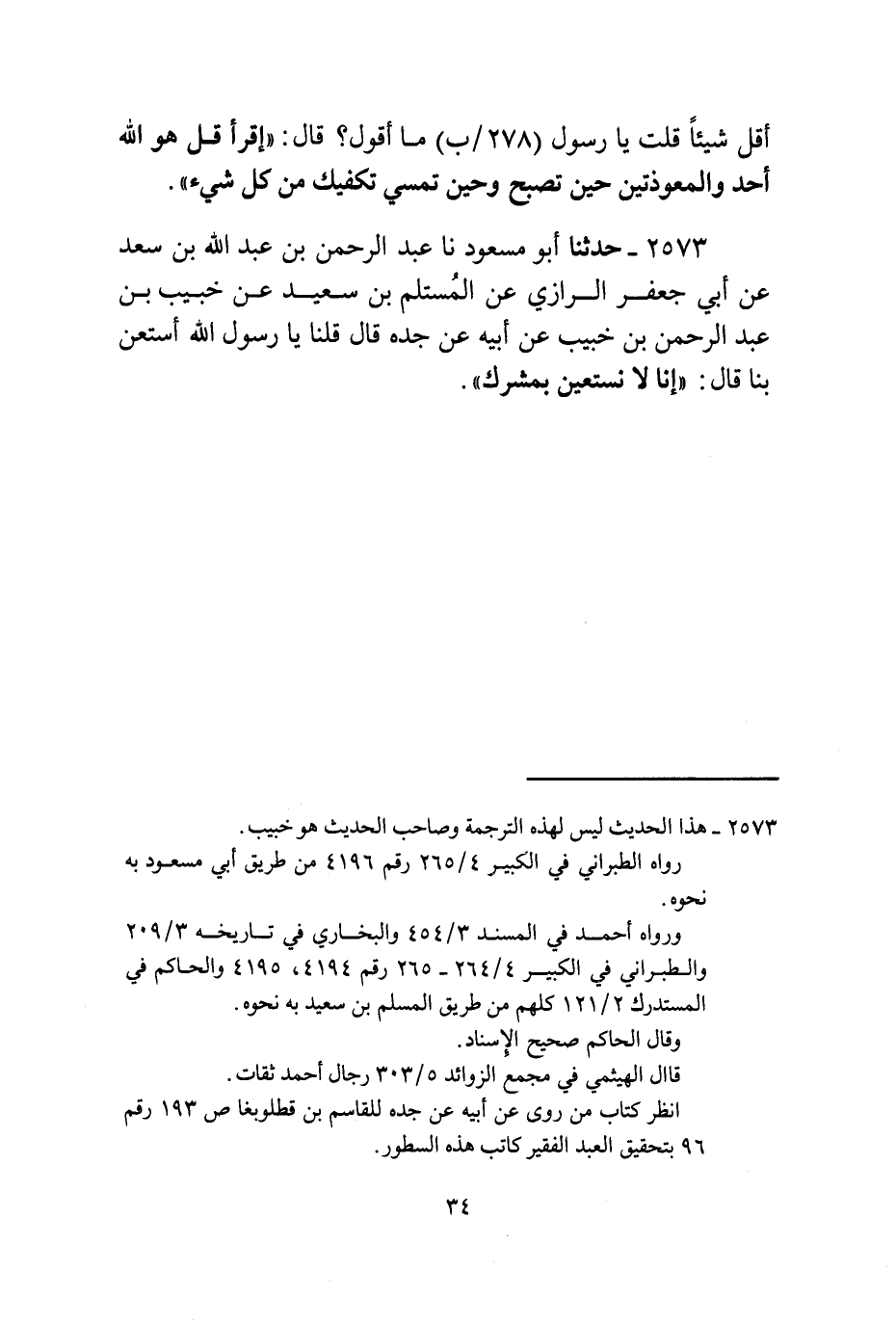 2573 - حَدَّثَنَا أَبُو مَسْعُودٍ، نا عَبْدُ الرَّحْمَنِ بْنُ عَبْدِ اللَّهِ بْنِ سَعْدٍ، عَنْ أَبِي جَعْفَرٍ الرَّازِيِّ، عَنِ الْمُسْتَلِمِ بْنِ سَعِيدٍ، عَنْ خُبَيْبِ بْنِ عَبْدِ الرَّحْمَنِ بْنِ خُبَيْبٍ، عَنْ أَبِيهِ، عَنْ جَدِّهِ قَالَ: قُلْنَا: يَا رَسُولَ اللَّهِ، اسْتَعِنْ بِنَا. قَالَ: «إِنَّا §لَا نَسْتَعِينُ بِمُشْرِكٍ»