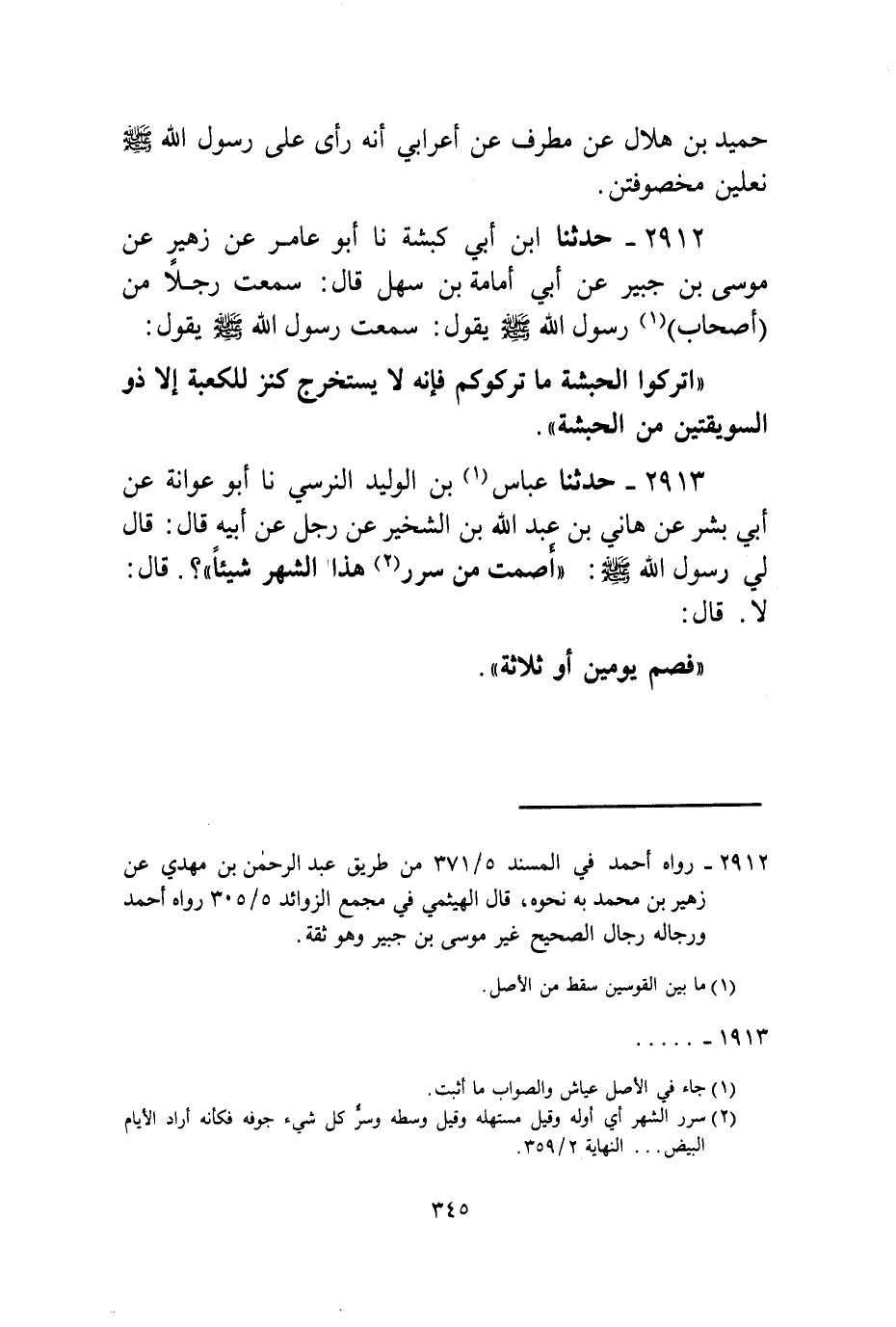 2912 - حَدَّثَنَا ابْنُ أَبِي كَبْشَةَ، نا أَبُو عَامِرٍ، عَنْ زُهَيْرٍ، عَنْ مُوسَى بْنِ جُبَيْرٍ، عَنْ أَبِي أُمَامَةَ بْنِ سَهْلٍ قَالَ: سَمِعْتُ رَجُلًا، مِنْ أَصْحَابِ رَسُولِ اللَّهِ صَلَّى اللهُ عَلَيْهِ وَسَلَّمَ §يَقُولُ: سَمِعْتُ رَسُولَ اللَّهِ صَلَّى اللهُ عَلَيْهِ وَسَلَّمَ: " يَقُولُ: «اتْرُكُوا الْحَبَشَةَ مَا تَرَكُوكُمْ فَإِنَّهُ لَا يَسْتَخْرِجُ كَنْزَ الْكَعْبَةِ إِلَّا ذُو السُّوَيْقَتَيْنِ مِنَ الْحَبَشَةِ»
