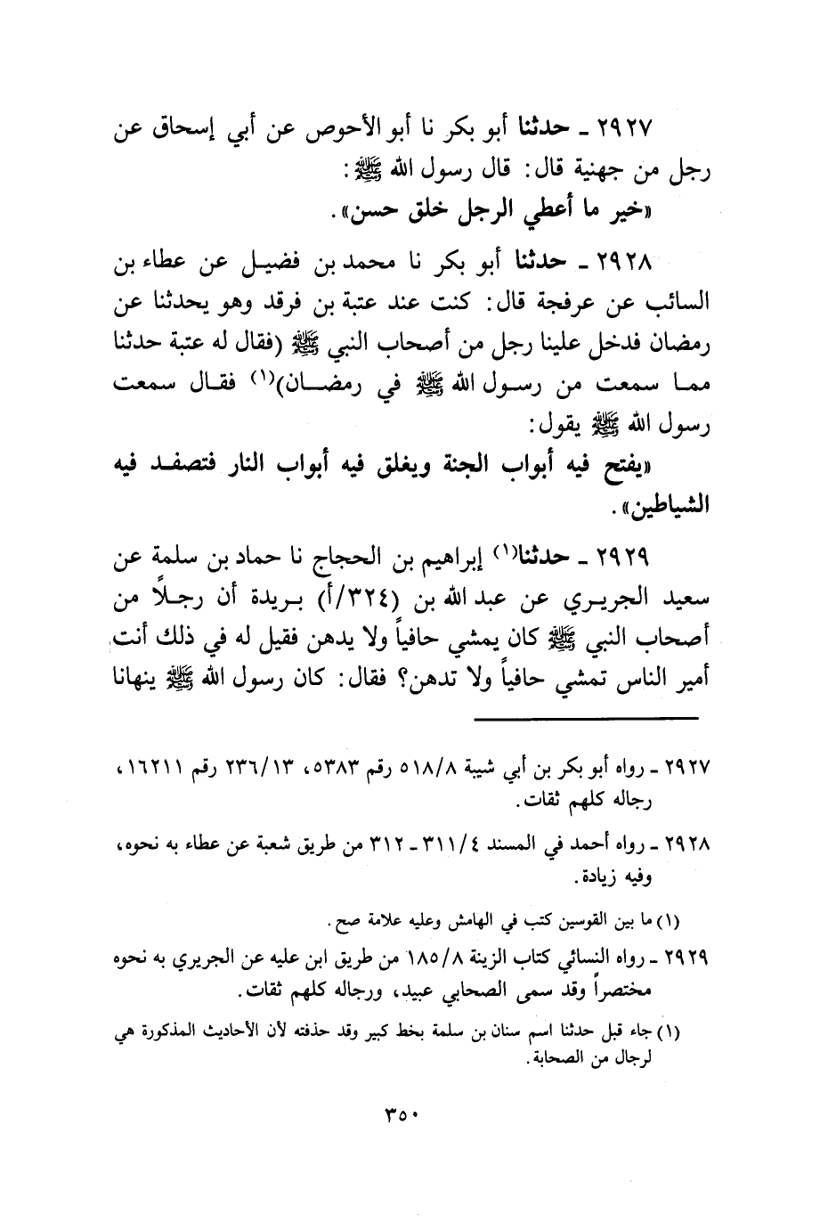 2929 - حَدَّثَنَا إِبْرَاهِيمُ بْنُ الْحَجَّاجِ، نا حَمَّادُ بْنُ سَلَمَةَ، عَنْ سَعِيدٍ الْجُرَيْرِيِّ، عَنْ عَبْدِ اللَّهِ بْنِ بُرَيْدَةَ، أَنَّ رَجُلًا مِنْ أَصْحَابِ النَّبِيِّ صَلَّى اللهُ عَلَيْهِ وَسَلَّمَ كَانَ يَمْشِي حَافِيًا وَلَا يَدَّهِنُ فَقِيلَ لَهُ فِي ذَلِكَ: أَنْتَ أَمِيرُ النَّاسِ تَمْشِي حَافِيًا وَلَا تَدَّهِنُ. فَقَالَ: كَانَ رَسُولُ اللَّهِ صَلَّى اللهُ عَلَيْهِ وَسَلَّمَ §يَنْهَانَا عَنْ كَثِيرٍ مِنِ الْإِرْفَاءِ وَهُوَ الِادِّهَانُ كُلَّ يَوْمٍ وَكَانَ يَأْمُرُنَا أَنْ نَحْتَفِيَ أَحْيَانًا "