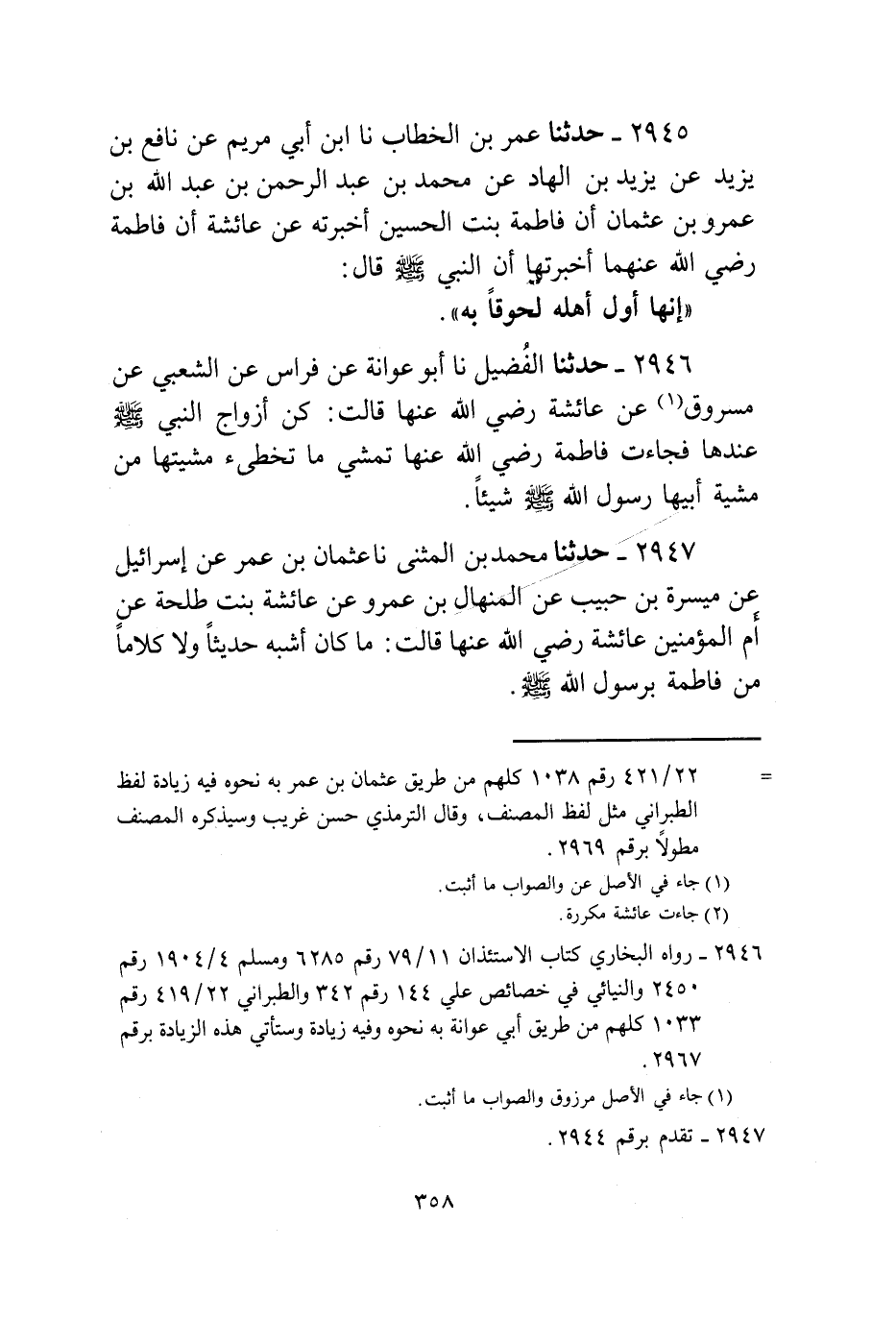 2946 - حَدَّثَنَا الْفُضَيْلُ، نا أَبُو عَوَانَةَ، عَنْ فِرَاسٍ، عَنِ الشَّعْبِيِّ، عَنْ مَسْرُوقٍ، عَنْ عَائِشَةَ، رَضِيَ اللَّهُ عَنْهَا قَالَتْ: كُنَّ أَزْوَاجُ النَّبِيِّ صَلَّى اللهُ عَلَيْهِ وَسَلَّمَ عِنْدَهَا فَجَاءَتْ فَاطِمَةُ رَضِيَ اللَّهُ عَنْهَا §تَمْشِي مَا تُخْطِئُ مِشْيَتَهَا مِنْ مِشْيَةِ أَبِيهَا رَسُولِ اللَّهِ صَلَّى اللهُ عَلَيْهِ وَسَلَّمَ شَيْئًا "