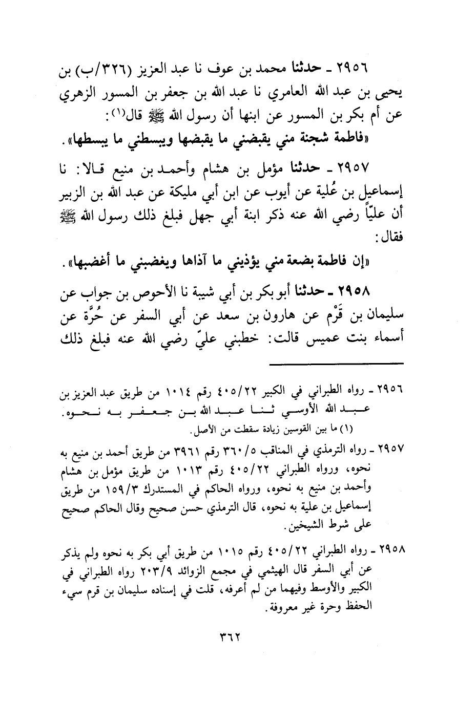 2956 - حَدَّثَنَا مُحَمَّدُ بْنُ عَوْفٍ، نا عَبْدُ الْعَزِيزِ بْنُ يَحْيَى بْنِ عَبْدِ اللَّهِ الْعَامِرِيِّ، نا عَبْدُ اللَّهِ بْنُ جَعْفَرِ بْنِ الْمِسْوَرِ الزُّهْرِيُّ، عَنْ أُمِّ بَكْرِ بْنِ الْمِسْوَرِ، عَنِ ابْنِهَا، أَنَّ رَسُولَ اللَّهِ صَلَّى اللهُ عَلَيْهِ وَسَلَّمَ قَالَ: «§فَاطِمَةُ شَجْنَةٌ مِنِّي يَقْبِضُنِي مَا يَقْبِضُهَا وَيَبْسُطُنِي مَا يَبْسُطُهَا»