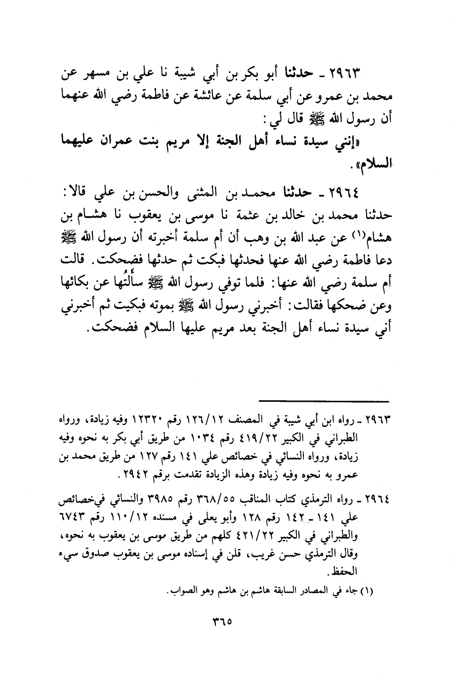 2963 - حَدَّثَنَا أَبُو بَكْرِ بْنُ أَبِي شَيْبَةَ، نا عَلِيُّ بْنُ مُسْهِرٍ، عَنْ مُحَمَّدِ بْنِ عَمْرٍو، عَنْ أَبِي سَلَمَةَ، عَنْ عَائِشَةَ، عَنْ فَاطِمَةَ، رَضِيَ اللَّهُ عَنْهُمَا، أَنَّ رَسُولَ اللَّهِ صَلَّى اللهُ عَلَيْهِ وَسَلَّمَ قَالَ لِي: «إِنَّنِي §سَيِّدَةُ نِسَاءِ أَهْلِ الْجَنَّةِ إِلَّا مَرْيَمَ بِنْتَ عِمْرَانَ عَلَيْهِمَا السَّلَامُ»
