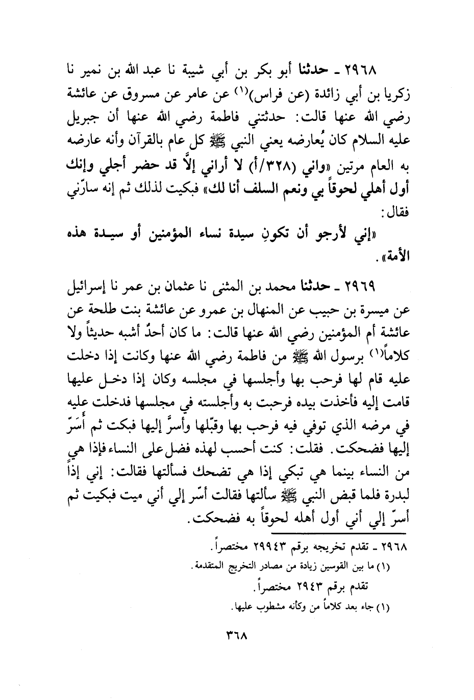 2968 - حَدَّثَنَا أَبُو بَكْرِ بْنُ أَبِي شَيْبَةَ، نا عَبْدُ اللَّهِ بْنُ نُمَيْرٍ، نا زَكَرِيَا بْنُ أَبِي زَائِدَةَ، عَنْ فِرَاسٍ، عَنْ عَامِرٍ، عَنْ مَسْرُوقٍ، عَنْ عَائِشَةَ، رَضِيَ اللَّهُ عَنْهَا قَالَتْ: حَدَّثَتْنِي فَاطِمَةُ، رَضِيَ اللَّهُ عَنْهَا أَنَّ جِبْرِيلَ عَلَيْهِ السَّلَامُ كَانَ يُعَارِضُهُ، يَعْنِي النَّبِيَّ صَلَّى اللهُ عَلَيْهِ وَسَلَّمَ، كُلَّ عَامٍ بِالْقُرْآنِ وَأَنَّهُ عَارَضَهُ بِهِ الْعَامَ مَرَّتَيْنِ، وَإِنِّي لَا أَرَانِي إِلَّا قَدْ حَضَرَ أَجْلِي وَإِنَّكِ أَوَّلُ أَهْلِي لُحُوقًا بِي وَنِعْمَ السَّلَفُ أَنَا لَكِ " فَبَكَيْتُ لِذَلِكَ، ثُمَّ إِنَّهُ سَارَّنِي فَقَالَ: «إِنِّي §لَأَرْجُو أَنْ تَكُونَ سَيِّدَةَ نِسَاءِ الْمُؤْمِنِينَ أَوْ سَيِّدَةَ هَذِهِ الْأُمَّةِ»