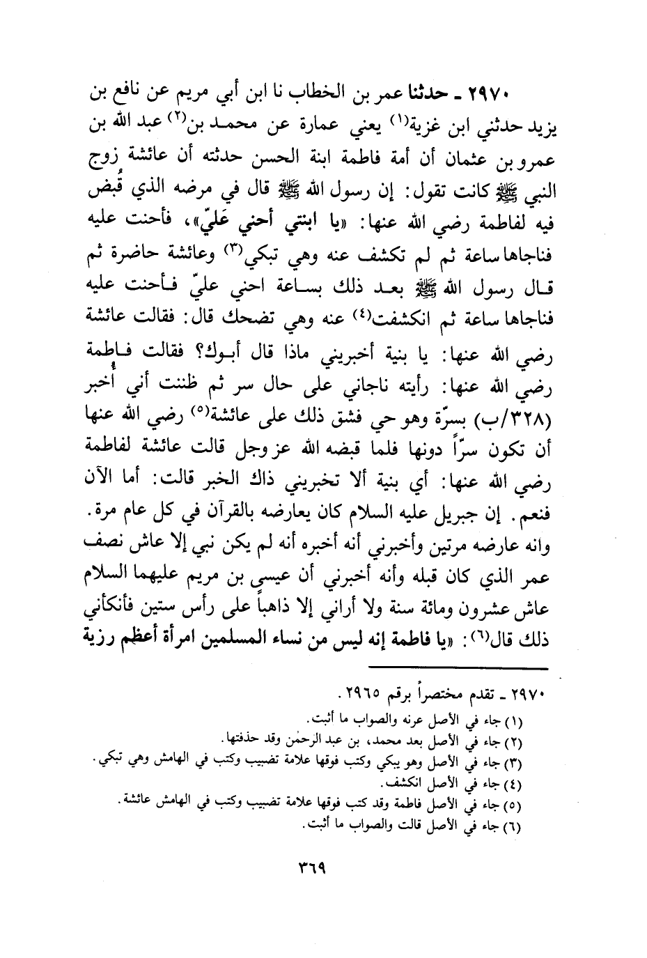 2970 - حَدَّثَنَا عُمَرُ بْنُ الْخَطَّابِ، نا ابْنُ أَبِي مَرْيَمَ، عَنْ نَافِعِ بْنِ يَزِيدَ، حَدَّثَنِي ابْنُ غَزِيَّةَ يَعْنِي عُمَارَةَ، عَنْ مُحَمَّدِ بْنِ عَبْدِ اللَّهِ بْنِ عَمْرِو بْنِ عُثْمَانَ، أَنَّ أُمَّهُ فَاطِمَةُ ابْنَةُ الْحَسَنِ حَدَّثَتْهُ أَنَّ عَائِشَةَ زَوْجَ النَّبِيِّ صَلَّى اللهُ عَلَيْهِ وَسَلَّمَ كَانَتْ تَقُولُ: إِنَّ رَسُولَ اللَّهِ صَلَّى اللهُ عَلَيْهِ وَسَلَّمَ قَالَ فِي مَرَضِهِ الَّذِي قُبِضَ فِيهِ لِفَاطِمَةَ رَضِيَ اللَّهُ عَنْهَا: «يَا ابْنَتِي أَحْنَى عَلَيَّ» فَأَحْنَتْ عَلَيْهِ فَنَاجَاهَا سَاعَةً ثُمَّ لَمْ تُكْشَفْ عَنْهُ وَهِيَ تَبْكِي وَعَائِشَةُ حَاضِرَةٌ، ثُمَّ قَالَ رَسُولُ اللَّهِ صَلَّى اللهُ عَلَيْهِ وَسَلَّمَ بَعْدَ ذَلِكَ بِسَاعَةٍ: أَحْنِي عَلَيَّ فَأَحْنَتْ عَلَيْهِ فَنَاجَاهَا سَاعَةً ثُمَّ انْكَشَفَتْ عَنْهُ وَهِيَ تَضْحَكُ قَالَ: فَقَالَتْ عَائِشَةُ رَضِيَ اللَّهُ عَنْهَا: يَا بُنَيَّةُ أَخْبِرِينِي مَاذَا قَالَ أَبُوكِ؟ فَقَالَتْ فَاطِمَةُ رَضِيَ اللَّهُ عَنْهَا رَأَيْتُهُ نَاجَانِي عَلَى حَالِ سِرٍّ ثُمَّ ظَنَنْتِ أَنِّي أُخْبِرُ بِسِرِّهِ وَهُوَ حَيٌّ؟ فَشَقَّ ذَلِكَ عَلَى عَائِشَةَ رَضِيَ اللَّهُ عَنْهَا أَنْ تَكُونَ سِرًّا دُونَهَا، فَلَمَّا قَبَضَهُ اللَّهُ عَزَّ وَجَلَّ قَالَتْ عَائِشَةُ لِفَاطِمَةَ رَضِيَ اللَّهُ عَنْها: أَيْ بُنَيَّةُ أَلَا تُخْبِرِينِي ذَاكَ الْخَبَرَ؟ قَالَتْ: أَمَّاَ الَآنَ فَنَعَمْ، إِنَّ جِبْرِيلَ عَلَيْهِ السَّلَامُ كَانَ يُعَارِضُهُ بِالْقُرْآنِ فِي كُلِّ عَامٍ مَرَّةً وَأَنَّهُ عَارَضَهُ مَرَّتَيْنِ وَأَخْبَرَنِي أَنَّهُ أَخْبَرَهُ أَنَّهُ لَمْ يَكُنْ نَبِيٌّ إِلَّا عَاشَ نِصْفَ عُمْرِ الَّذِي كَانَ قَبْلَهُ وَأَنَّهُ أَخْبَرَنِي أَنَّ عِيسَى ابْنَ مَرْيَمَ عَلَيْهِمَا السَّلَامُ عَاشَ عِشْرِينَ وَمِائَةَ سَنَةٍ وَلَا أُرَانِي إِلَّا ذَاهِبًا عَلَى رَأْسِ سِتِّينَ فَأَنْكَأَنِي ذَلِكَ. قَالَ: «يَا فَاطِمَةُ إِنَّهُ §لَيْسَ مِنْ نِسَاءِ الْمُسْلِمِينَ امْرَأَةٌ أَعْظَمَ رَزِيَّةً مِنْكِ، فَلَا تَكُونِي مِنْ أَدْنَى امْرَأَةٍ صَبْرًا» ثُمَّ نَاجَانِي فِي الْمَرَّةِ الْأَخِيرَةِ فَأَخْبَرَنِي أَنِّي أَوَّلُ أَهْلِهِ لُحُوقًا بِهِ وَقَالَ: «إِنَّكِ سَيِّدَةُ أَهْلِ الْجَنَّةِ إِلَّا مَا كَانَ مِنَ الْبَتُولِ مَرْيَمَ ابْنَةِ عِمْرَانَ»