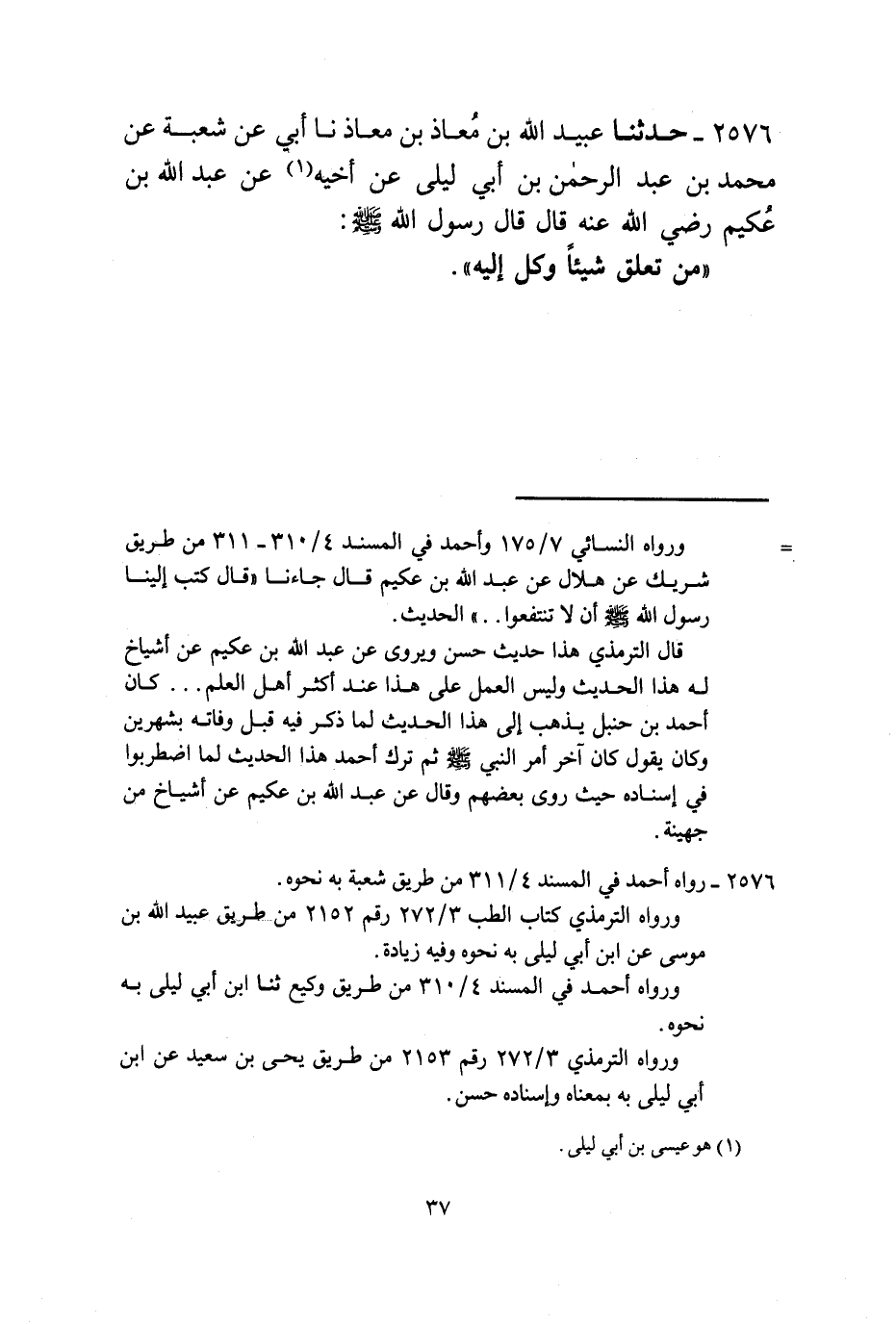 2576 - حَدَّثَنَا عُبَيْدُ اللَّهِ بْنُ مُعَاذِ بْنِ مُعَاذٍ، نا أَبِي، عَنْ شُعْبَةَ، عَنْ مُحَمَّدِ بْنِ عَبْدِ الرَّحْمَنِ بْنِ أَبِي لَيْلَى، عَنْ أَخِيهِ، عَنْ عَبْدِ اللَّهِ بْنِ عُكَيْمٍ رَضِيَ اللَّهُ عَنْهُ قَالَ: قَالَ رَسُولُ اللَّهِ صَلَّى اللهُ عَلَيْهِ وَسَلَّمَ: «§مَنْ تَعَلَّقَ شَيْئًا وُكِلَ إِلَيْهِ»