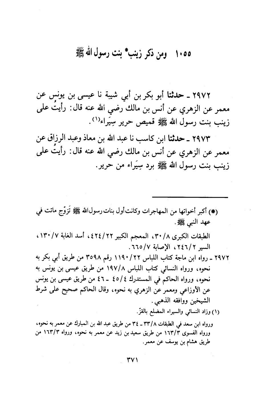2973 - حَدَّثَنَا ابْنُ كَاسِبٍ، نا عَبْدُ اللَّهِ بْنُ مُعَاذٍ، وَعَبْدُ الرَّزَّاقِ، عَنْ مَعْمَرٍ، عَنِ الزُّهْرِيِّ، عَنْ أَنَسِ بْنِ مَالِكٍ، رَضِيَ اللَّهُ عَنْهُ قَالَ: §رَأَيْتُ عَلَى زَيْنَبَ بِنْتِ رَسُولِ اللَّهِ صَلَّى اللهُ عَلَيْهِ وَسَلَّمَ بُرْدَ سِيَرَاءَ مِنْ حَرِيرٍ "
