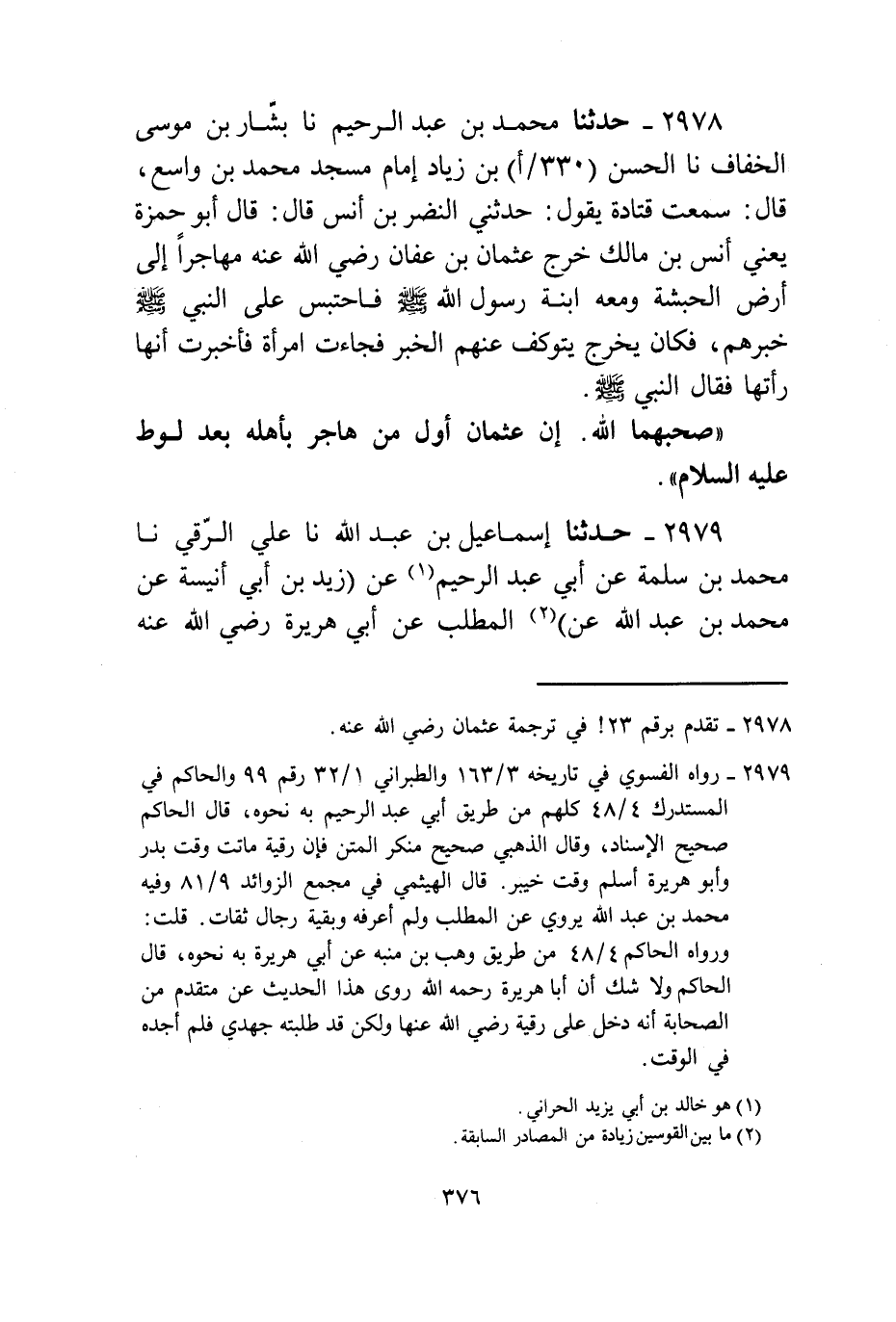 2978 - حَدَّثَنَا مُحَمَّدُ بْنُ عَبْدِ الرَّحِيمِ، نا بَشَّارُ بْنُ مُوسَى الْخَفَّافُ، نا الْحَسَنُ بْنُ زِيَادٍ، إِمَامُ مَسْجِدِ مُحَمَّدِ بْنِ وَاسِعٍ قَالَ: سَمِعْتُ قَتَادَةَ، يَقُولُ: حَدَّثَنِي النَّضْرُ بْنُ أَنَسٍ قَالَ: قَالَ أَبُو حَمْزَةَ يَعْنِي أَنَسَ بْنَ مَالِكٍ: خَرَجَ عُثْمَانُ بْنُ عَفَّانَ رَضِيَ اللَّهُ عَنْهُ مُهَاجِرًا إِلَى أَرْضِ الْحَبَشَةِ وَمَعَهُ ابْنَةُ رَسُولِ اللَّهِ صَلَّى اللهُ عَلَيْهِ وَسَلَّمَ فَاحْتَبَسَ عَلَى النَّبِيِّ صَلَّى اللهُ عَلَيْهِ وَسَلَّمَ خَبَرُهُمْ فَكَانَ يَخْرُجُ يَتَوَكَّفُ عَنْهُمُ الْخَبَرُ فَجَاءَتِ امْرَأَةٌ فَأَخْبَرَتْ أَنَّهَا رَأَتْهَا فَقَالَ النَّبِيُّ صَلَّى اللهُ عَلَيْهِ وَسَلَّمَ: «صَحِبَهُمَا اللَّهُ، إِنَّ §عُثْمَانَ أَوَّلُ مَنْ هَاجَرَ بِأَهْلِهِ بَعْدَ لُوطٍ عَلَيْهِ السَّلَامُ»