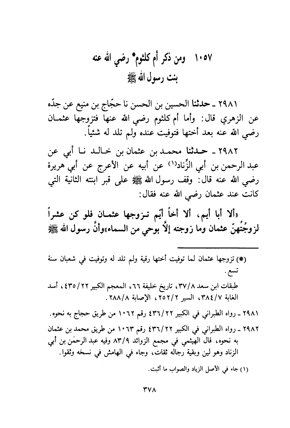 2981 - حَدَّثَنَا الْحُسَيْنُ بْنُ الْحَسَنِ، نا حَجَّاجُ بْنُ مَنِيعٍ، عَنْ جَدِّهِ، عَنِ الزُّهْرِيِّ قَالَ: §وَأَمَّا أُمُّ كُلْثُومٍ رَضِيَ اللَّهُ عَنْهَا فَتَزَوَّجَهَا عُثْمَانُ رَضِيَ اللَّهُ عَنْهُ بَعْدَ أُخْتِهَا فَتُوُفِّيَتْ عِنْدَهُ وَلَمْ تَلِدْ لَهُ شَيْئًا "