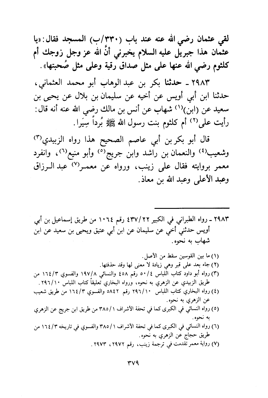 2983 - حَدَّثَنَا بَكْرُ بْنُ عَبْدِ الْوَهَّابِ أَبُو مُحَمَّدٍ الْعُثْمَانِيُّ، حَدَّثَنَا ابْنُ أَبِي أُوَيْسٍ، عَنْ أَخِيهِ، عَنْ سُلَيْمَانَ بْنِ بِلَالٍ، عَنْ يَحْيَى بْنِ سَعِيدٍ، عَنِ ابْنِ شِهَابٍ، عَنْ أَنَسِ بْنِ مَالِكٍ، رَضِيَ اللَّهُ عَنْهُ أَنَّهُ قَالَ: «§رَأَيْتُ عَلَى أُمِّ كُلْثُومِ بِنْتِ رَسُولِ اللَّهِ صَلَّى اللهُ عَلَيْهِ وَسَلَّمَ بُرْدًا سِيَرَا» قَالَ أَبُو بَكْرِ بْنُ أَبِي عَاصِمٍ: الصَّحِيحُ هَذَا رَوَاهُ الزُّبَيْدِيُّ وَشُعَيْبٌ وَالنُّعْمَانُ بْنُ رَاشِدٍ وَابْنُ جُرَيْجٍ وَأَبُو مَنِيعٍ، وَانْفَرَدَ مَعْمَرٌ بِرِوَايَتِهِ فَقَالَ: عَلَى زَيْنَبَ، وَرَوَاهُ عَنْ مَعْمَرٍ عَبْدُ الرَّزَّاقِ وَعَبْدُ الْأَعْلَى وَعَبْدُ اللَّهِ بْنُ مُعَاذٍ
