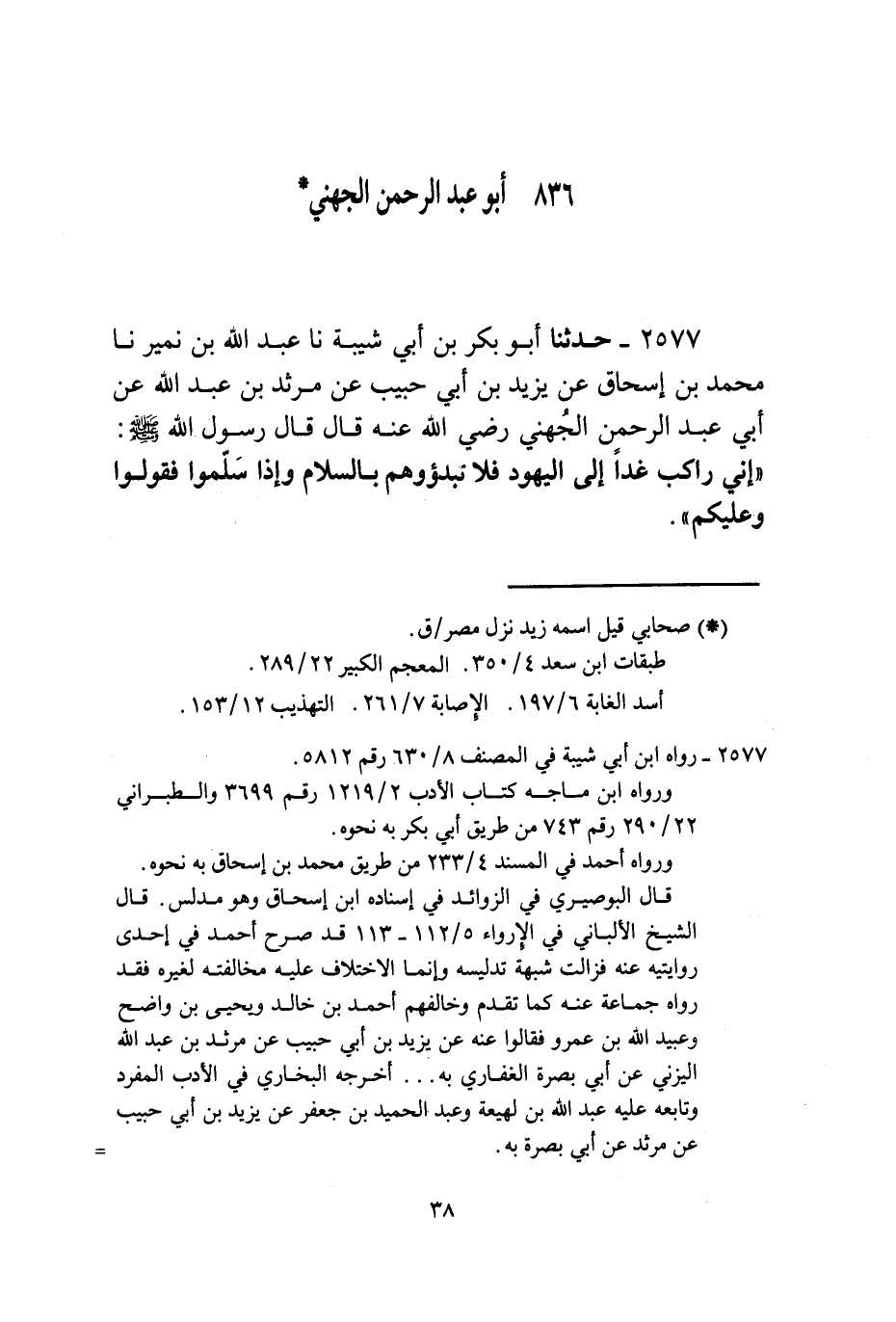 2577 - حَدَّثَنَا أَبُو بَكْرِ بْنُ أَبِي شَيْبَةَ، نا عَبْدُ اللَّهِ بْنُ نُمَيْرٍ، نا مُحَمَّدُ بْنُ إِسْحَاقَ، عَنْ يَزِيدَ بْنِ أَبِي حَبِيبٍ، عَنْ مَرْثَدِ بْنِ عَبْدِ اللَّهِ، عَنْ أَبِي عَبْدِ الرَّحْمَنِ الْجُهَنِيِّ رَضِيَ اللَّهُ عَنْهُ قَالَ: قَالَ رَسُولُ اللَّهِ صَلَّى اللهُ عَلَيْهِ وَسَلَّمَ: " إِنِّي §رَاكِبٌ غَدًا إِلَى الْيَهُودِ فَلَا تَبْدَءُوهُمْ بِالسَّلَامِ، وَإِذَا سَلَّمُوا فَقُولُوا: وَعَلَيْكُمْ "