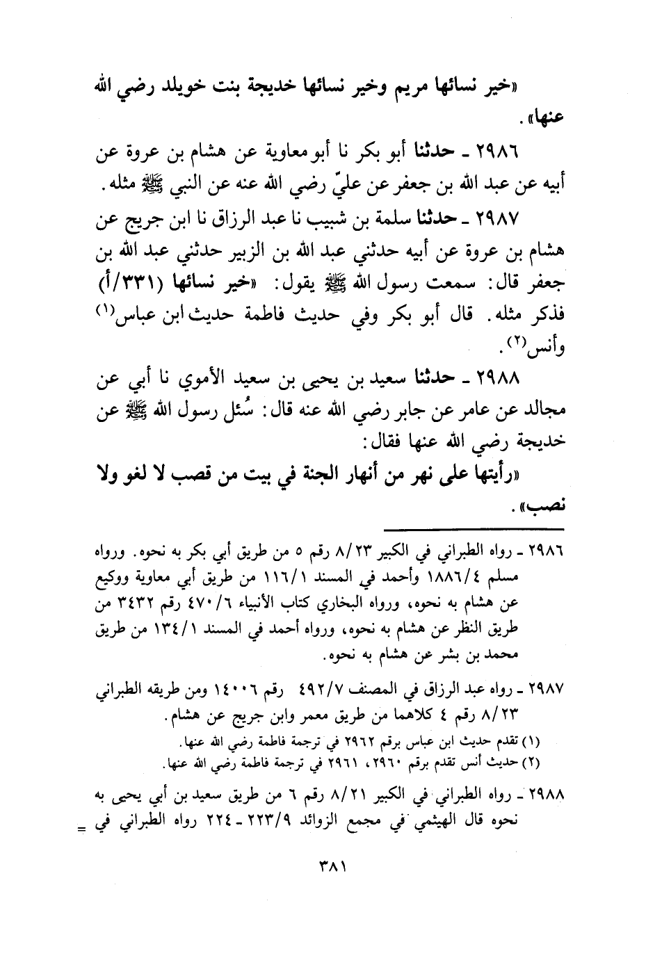 2988 - حَدَّثَنَا سَعِيدُ بْنُ يَحْيَى بْنِ سَعِيدٍ الْأُمَوِيُّ، نا أَبِي، عَنْ مُجَالِدٍ، عَنْ عَامِرٍ، عَنْ جَابِرٍ رَضِيَ اللَّهُ عَنْهُ قَالَ: §سُئِلَ رَسُولُ اللَّهِ صَلَّى اللهُ عَلَيْهِ وَسَلَّمَ عَنْ خَدِيجَةَ رَضِيَ اللَّهُ عَنْهَا فَقَالَ: «رَأَيْتُهَا عَلَى نَهَرٍ مِنْ أَنْهَارِ الْجَنَّةِ فِي بَيْتٍ مِنْ قَصَبٍ لَا لَغْوٌ وَلَا نَصَبٌ»