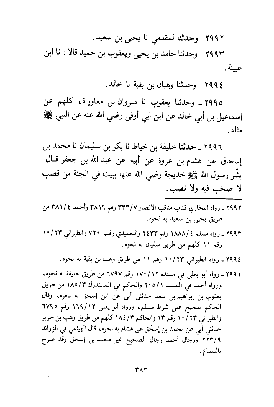 2996 - حَدَّثَنَا خَلِيفَةُ بْنُ خَيَّاطٍ، نا بَكْرُ بْنُ سُلَيْمَانَ، نا مُحَمَّدُ بْنُ إِسْحَاقَ، عَنْ هِشَامِ بْنِ عُرْوَةَ، عَنْ أَبِيهِ، عَنْ عَبْدِ اللَّهِ بْنِ جَعْفَرٍ قَالَ: «§بَشَّرَ رَسُولُ اللَّهِ صَلَّى اللهُ عَلَيْهِ وَسَلَّمَ خَدِيجَةَ رَضِيَ اللَّهُ عَنْهَا بِبَيْتٍ فِي الْجَنَّةِ مِنْ قَصَبٍ لَا صَخَبَ فِيهِ وَلَا نَصَبَ»
