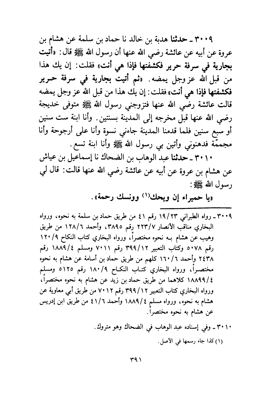 3009 - حَدَّثَنَا هُدْبَةُ بْنُ خَالِدٍ، نا حَمَّادُ بْنُ سَلَمَةَ، عَنْ هِشَامِ بْنِ عُرْوَةَ، عَنْ أَبِيهِ، عَنْ عَائِشَةَ، رَضِيَ اللَّهُ عَنْهَا، أَنَّ رَسُولَ اللَّهِ صَلَّى اللهُ عَلَيْهِ وَسَلَّمَ قَالَ: " §أُتِيتُ بِجَارِيَةٍ فِي سُرْفَةِ حَرِيرٍ فَكَشَفْتُهَا فَإِذَا هِيَ أَنْتِ فَقُلْتُ: إِنْ يَكُ هَذَا مِنْ قِبَلِ اللَّهِ عَزَّ وَجَلَّ يُمْضِهِ، ثُمَّ أُتِيتُ بِجَارِيَةٍ فِي سُرْفَةِ حَرِيرِ فَكَشَفْتُهَا فَإِذَا هِيَ أَنْتِ فَقُلْتُ: إِنْ يَكُ هَذَا مِنْ قِبَلِ اللَّهِ عَزَّ وَجَلَّ يُمْضِهِ " قَالَتْ عَائِشَةُ رَضِيَ اللَّهُ عَنْهَا: فَتَزَوَّجَنِي رَسُولُ اللَّهِ صَلَّى اللهُ عَلَيْهِ وَسَلَّمَ مُتَوَفَّى خَدِيجَةَ رَضِيَ اللَّهُ عَنْهَا قَبْلَ مَخْرَجِهِ إِلَى الْمَدِينَةِ بِسَنَتَيْنِ وَأَنَا ابْنَةُ سِتِّ سِنِينَ أَوْ سَبْعِ سِنِينَ، فَلَمَّا قَدِمْنَا الْمَدِينَةَ جَاءَنِي نِسْوَةٌ وَأَنَا عَلَى أُرْجُوحَةٍ وَأَنَا مُجَمَّمَةٌ فَدَهَنُونِي وَأَتَيْنَ بِي رَسُولَ اللَّهِ صَلَّى اللهُ عَلَيْهِ وَسَلَّمَ وَأَنَا ابْنَةُ تِسْعٍ "