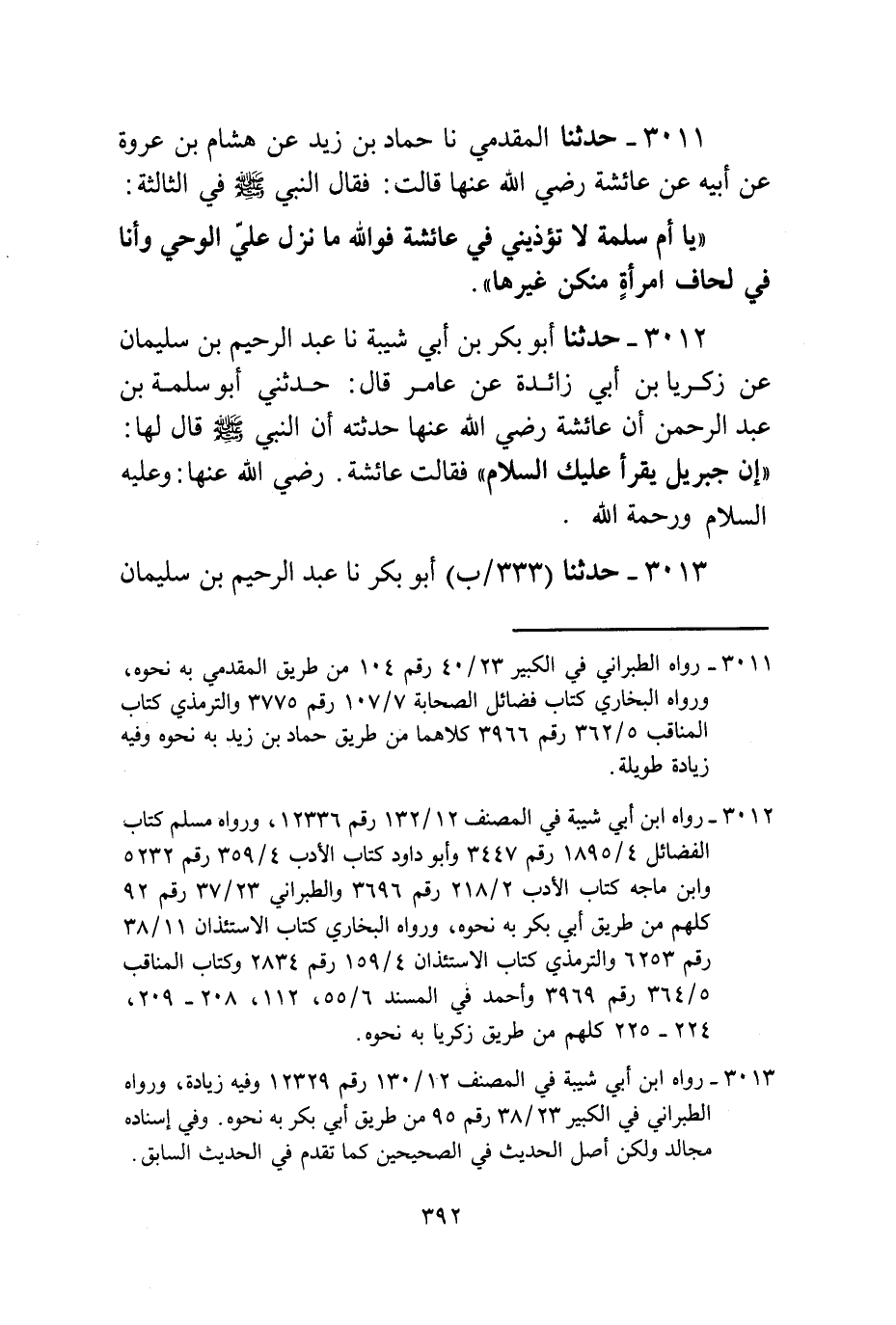 3011 - حَدَّثَنَا الْمُقَدَّمِيُّ، نا حَمَّادُ بْنُ زَيْدٍ، عَنْ هِشَامِ بْنِ عُرْوَةَ، عَنْ أَبِيهِ، عَنْ عَائِشَةَ، رَضِيَ اللَّهُ عَنْهَا قَالَتْ: فَقَالَ النَّبِيُّ صَلَّى اللهُ عَلَيْهِ وَسَلَّمَ فِي الثَّالِثَةِ: «يَا أُمَّ سَلَمَةَ §لَا تُؤْذِينِي فِي عَائِشَةَ، فَوَاللَّهِ مَا نَزَلَ عَلَيَّ الْوَحْيُ وَأَنَا فِي لِحَافِ امْرَأَةٍ مِنْكُنَّ غَيْرِهَا»