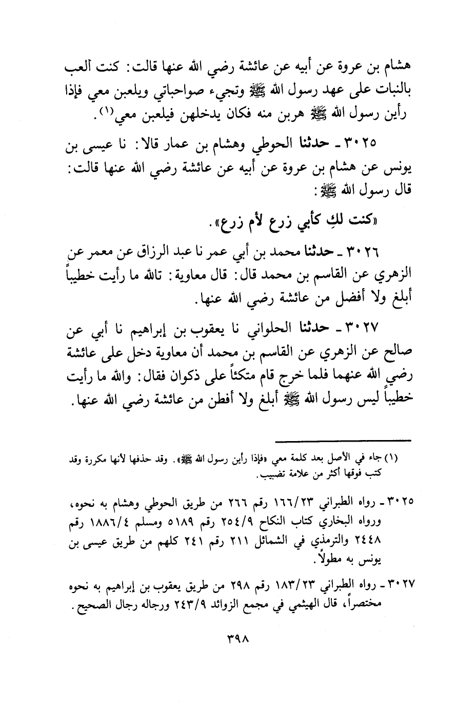 3025 - حَدَّثَنَا الْحَوْطِيُّ، وَهِشَامُ بْنُ عَمَّارٍ قَالَا: نا عِيسَى بْنُ يُونُسَ، عَنْ هِشَامِ بْنِ عُرْوَةَ، عَنْ أَبِيهِ، عَنْ عَائِشَةَ، رَضِيَ اللَّهُ عَنْهَا قَالَتْ: قَالَ رَسُولُ اللَّهِ صَلَّى اللهُ عَلَيْهِ وَسَلَّمَ: «§كُنْتُ لَكَ كَأَبِي زَرْعٍ لِأُمِّ زَرْعٍ»