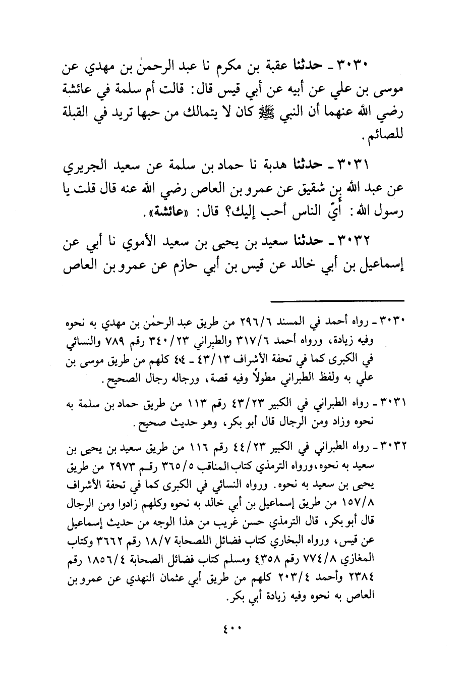 3031 - حَدَّثَنَا هُدْبَةُ، نا حَمَّادُ بْنُ سَلَمَةَ، عَنْ سَعِيدٍ الْجُرَيْرِيِّ، عَنْ عَبْدِ اللَّهِ بْنِ شَقِيقٍ، عَنْ عَمْرِو بْنِ الْعَاصِ، رَضِيَ اللَّهُ عَنْهُ قَالَ: قُلْتُ: يَا رَسُولَ اللَّهِ، §أَيُّ النَّاسِ أَحَبُّ إِلَيْكَ؟ قَالَ: «عَائِشَةُ»