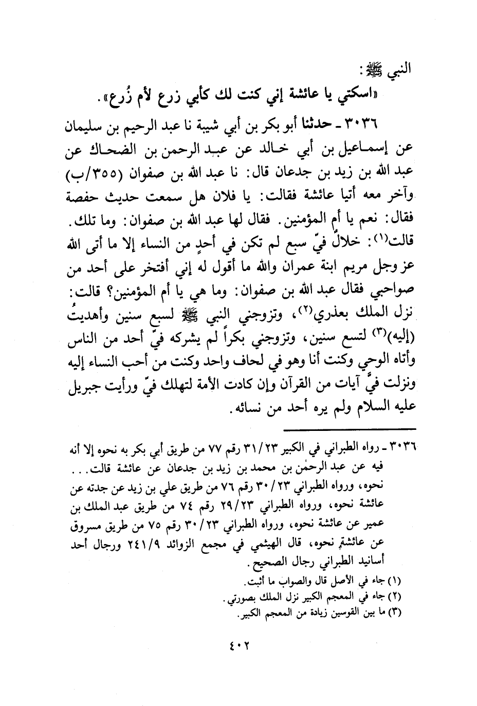 3036 - حَدَّثَنَا أَبُو بَكْرِ بْنُ أَبِي شَيْبَةَ، نا عَبْدُ الرَّحِيمِ بْنُ سُلَيْمَانَ، عَنْ إِسْمَاعِيلَ بْنِ أَبِي خَالِدٍ، عَنْ عَبْدِ الرَّحْمَنِ بْنِ الضَّحَّاكِ، عَنْ عَبْدِ اللَّهِ بْنِ زَيْدِ بْنِ جُدْعَانَ قَالَ: نا عَبْدُ اللَّهِ بْنُ صَفْوَانَ، وَآخَرُ مَعَهُ أَتَيَا عَائِشَةَ فَقَالَتْ: يَا فُلَانُ، هَلْ سَمِعْتَ حَدِيثَ حَفْصَةَ؟ فَقَالَ: نَعَمْ يَا أُمَّ الْمُؤْمِنِينَ. فَقَالَ لَهَا عَبْدُ اللَّهِ بْنُ صَفْوَانَ: وَمَا تِلْكَ؟ قَالَتْ: خِلَالٌ فِيَّ سَبْعٌ لَمْ تَكُنْ فِي أَحَدٍ مِنَ النِّسَاءِ إِلَّا مَا أَتَى اللَّهُ عَزَّ وَجَلَّ مَرْيَمَ ابْنَةَ عِمْرَانَ وَاللَّهِ مَا أَقُولُ لَهُ إِنِّي أَفْتَخِرُ عَلَى أَحَدٍ مِنْ صَوَاحِبِي. فَقَالَ عَبْدُ اللَّهِ بْنُ صَفْوَانَ: وَمَا هِيَ يَا أُمَّ الْمُؤْمِنِينَ؟ قَالَتْ: نَزَلَ الْمَلَكُ بِعُذْرِي، §وَتَزَوَّجَنِي النَّبِيُّ صَلَّى اللهُ عَلَيْهِ وَسَلَّمَ لِسَبْعِ سِنِينَ وَأُهْدِيتُ إِلَيْهِ لِتِسْعِ سِنِينَ، وَتَزَوَّجَنِي بِكْرًا لَمْ يُشْرِكْهُ فِيَّ أَحَدٌ مِنَ النَّاسِ، وَأَتَاهُ الْوَحْيُ وَكُنْتُ أَنَا وَهُوَ فِي لِحَافٍ وَاحِدٍ، وَكُنْتُ مِنْ أَحَبِّ النِّسَاءِ إِلَيْهِ، وَنَزَلَتْ فِيَّ آيَاتٌ مِنَ الْقُرْآنِ، وَإِنْ كَادَتِ الْأُمَّةُ لِتَهْلَكَ فِي وَرَأَيْتُ جِبْرِيلَ عَلَيْهِ السَّلَامُ وَلَمْ يَرَهُ أَحَدٌ مِنْ نِسَائِهِ "