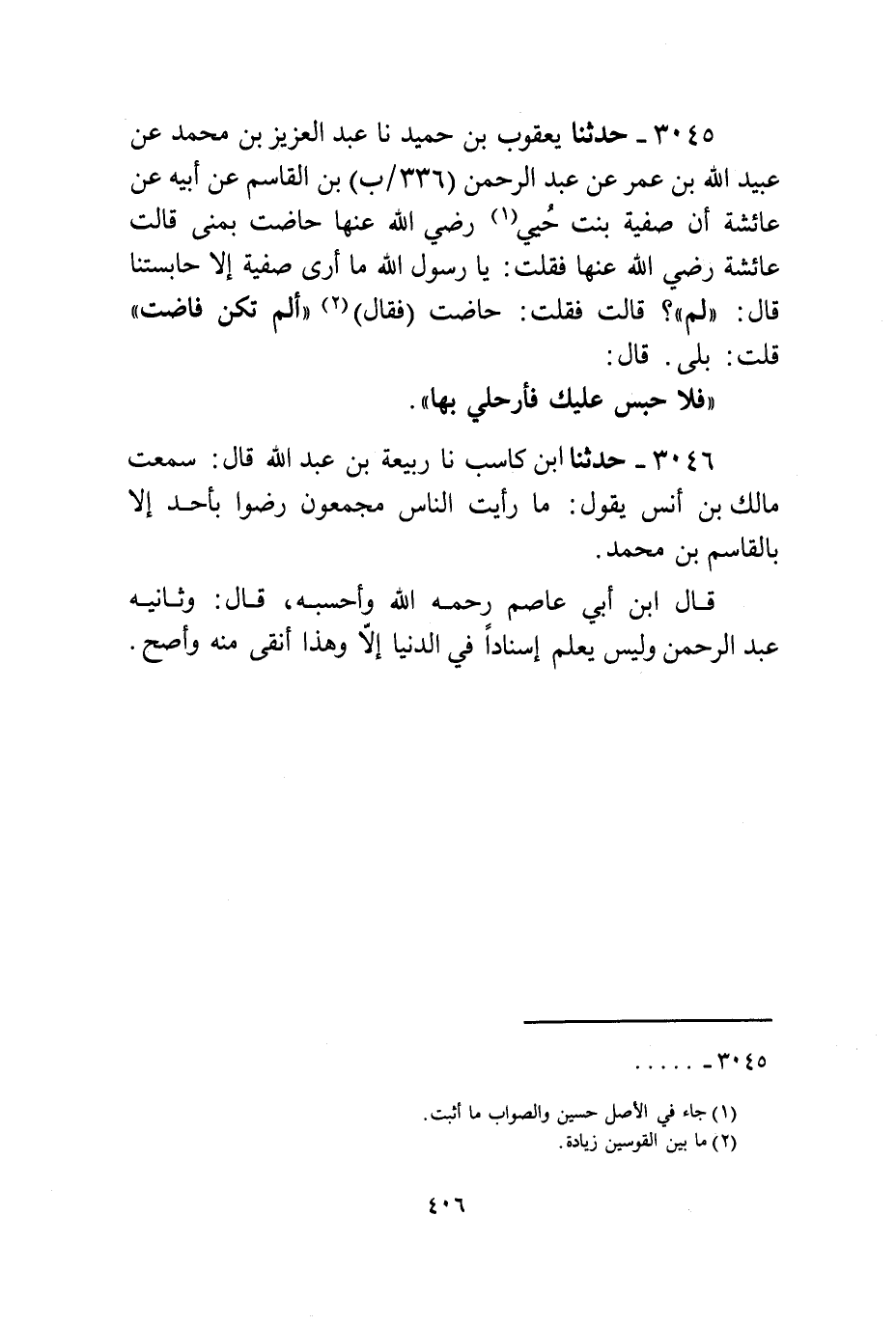 3045 - حَدَّثَنَا يَعْقُوبُ بْنُ حُمَيْدٍ، نا عَبْدُ الْعَزِيزِ بْنُ مُحَمَّدٍ، عَنْ عُبَيْدِ اللَّهِ بْنِ عُمَرَ، عَنْ عَبْدِ الرَّحْمَنِ بْنِ الْقَاسِمِ، عَنْ أَبِيهِ، عَنْ عَائِشَةَ، أَنَّ صَفِيَّةَ بِنْتَ حُيَيٍّ، رَضِيَ اللَّهُ عَنْهَا حَاضَتْ بِمِنًى، قَالَتْ عَائِشَةُ رَضِيَ اللَّهُ عَنْهَا: فَقُلْتُ: يَا رَسُولَ اللَّهِ، §مَا أَرَى صَفِيَّةَ إِلَّا حَابِسَتَنَا. قَالَ: «لِمَ؟» قَالَتْ: فَقُلْتُ: حَاضَتْ. فَقَالَ: «أَلَمْ تَكُنْ فَاضَتْ؟» قُلْتُ: بَلَى. قَالَ: «فَلَا حَبْسَ عَلَيْكِ فَارْحَلِي بِهَا»