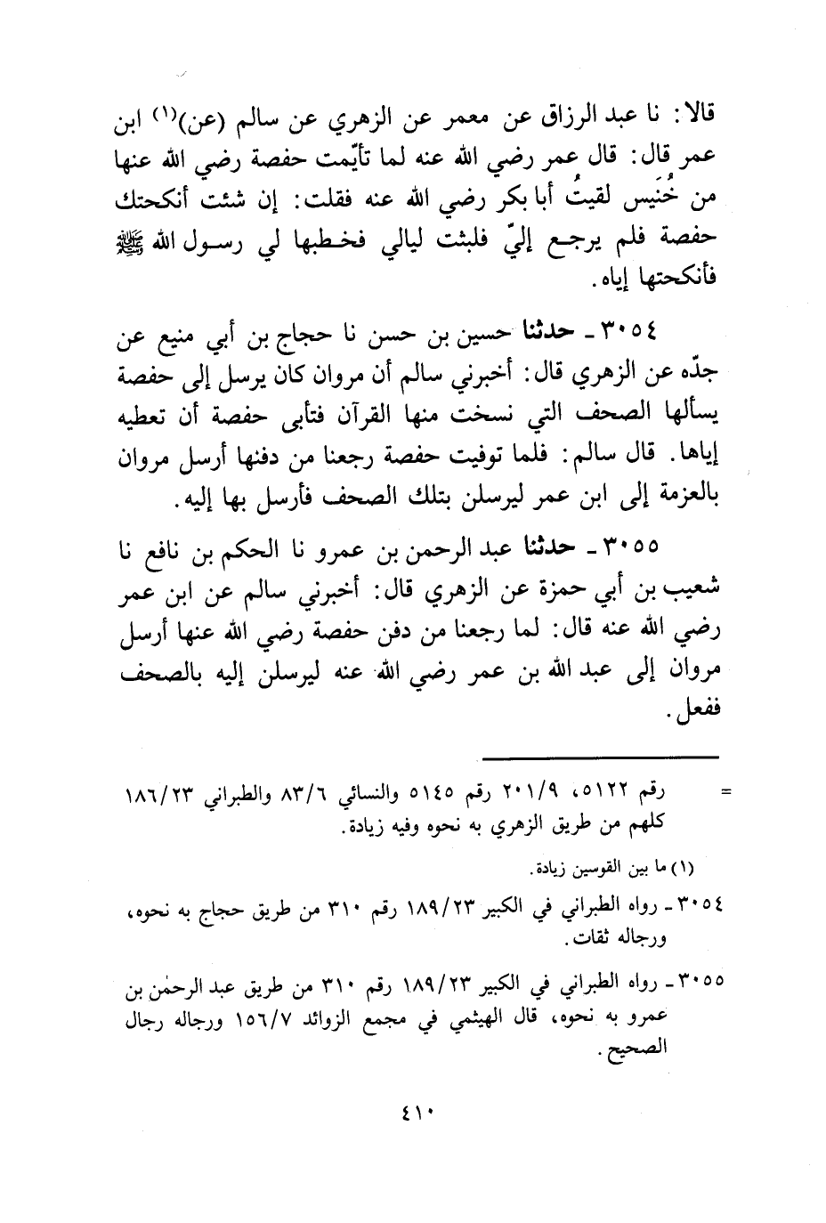 3054 - حَدَّثَنَا حُسَيْنُ بْنُ حَسَنٍ، نا حَجَّاجُ بْنُ أَبِي مَنِيعٍ، عَنْ جَدِّهِ، عَنِ الزُّهْرِيِّ، قَالَ: أَخْبَرَنِي سَالِمٌ، أَنَّ مَرْوَانَ، كَانَ يُرْسِلُ إِلَى حَفْصَةَ يَسْأَلُهَا الصُّحُفَ الَّتِي نُسِخَتْ مِنْهَا الْقُرْآنَ فَتَأْبَى حَفْصَةُ أَنْ تُعْطِيَهُ إِيَّاهَا. قَالَ سَالِمٌ: §فَلَمَّا تُوُفِّيَتْ حَفْصَةُ رَجَعْنَا مِنْ دَفْنِهَا أَرْسَلَ مَرْوَانُ بِالْعَزْمَةِ إِلَى ابْنِ عُمَرَ لَيُرْسِلَنَّ بِتِلْكَ الصُّحُفِ فَأَرْسَلَ بِهَا إِلَيْهِ "