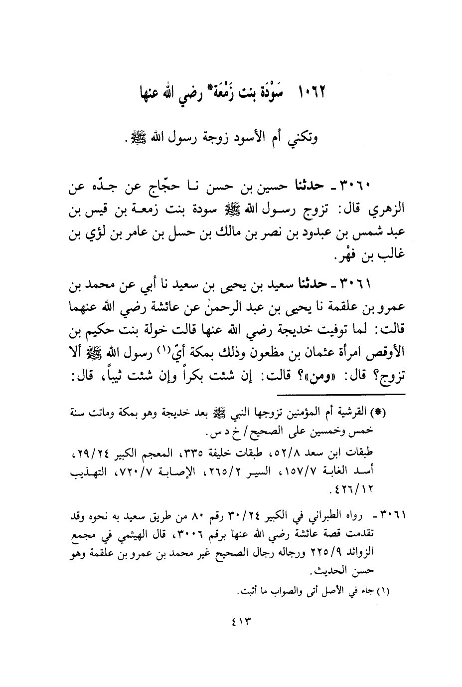 3060 - حَدَّثَنَا حُسَيْنُ بْنُ حَسَنٍ، نا حَجَّاجٌ، عَنْ جَدِّهِ، عَنِ الزُّهْرِيِّ، قَالَ: §تَزَوَّجَ رَسُولُ اللَّهِ صَلَّى اللهُ عَلَيْهِ وَسَلَّمَ سَوْدَةَ بِنْتَ زَمْعَةَ بْنِ قَيْسِ بْنِ عَبْدِ شَمْسِ بْنِ عَبْدِ وُدِّ بْنِ نَصْرِ بْنِ مَالِكِ بْنِ حَسَلِ بْنِ عَامِرِ بْنِ لُؤَيِّ بْنِ غَالِبِ بْنِ فِهْرٍ "