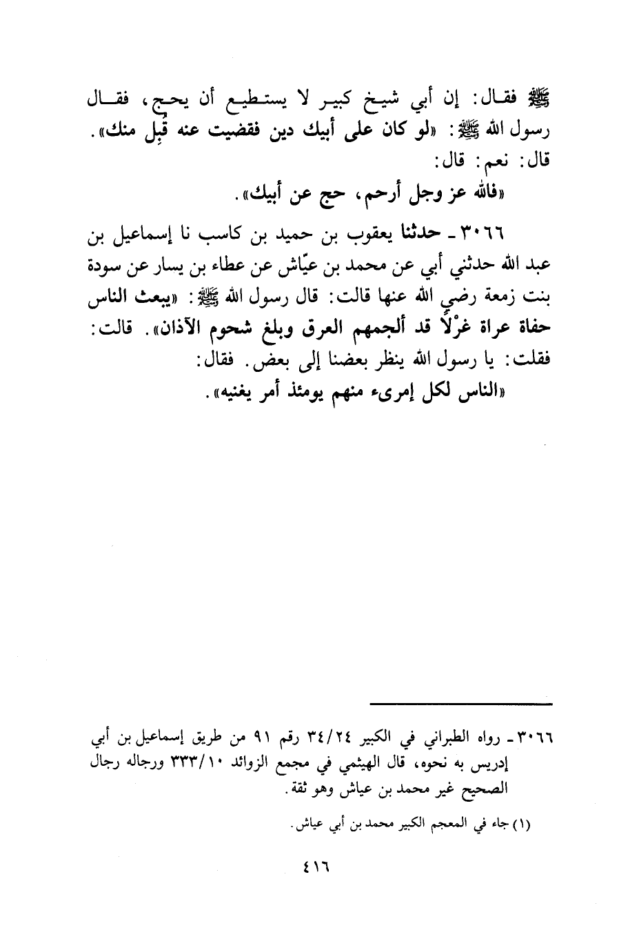 3066 - حَدَّثَنَا يَعْقُوبُ بْنُ حُمَيْدِ بْنِ كَاسِبٍ، نا إِسْمَاعِيلُ بْنُ عَبْدِ اللَّهِ، حَدَّثَنِي أَبِي، عَنْ مُحَمَّدِ بْنِ عَيَّاشٍ، عَنْ عَطَاءِ بْنِ يَسَارٍ، عَنْ سَوْدَةَ بِنْتِ زَمْعَةَ، رَضِيَ اللَّهُ عَنْهَا قَالَتْ: قَالَ رَسُولُ اللَّهِ صَلَّى اللهُ عَلَيْهِ وَسَلَّمَ: «§يُبْعَثُ النَّاسُ حُفَاةً عُرَاةً غُرْلًا، قَدْ أَلْجَمَهُمُ الْعِرْقُ وَبَلَغَ شُحُومَ الْآذَانِ» قَالَتْ: فَقُلْتُ: يَا رَسُولَ اللَّهِ، يَنْظُرُ بَعْضُنَا إِلَى بَعْضٍ؟ فَقَالَ: النَّاسُ لِكُلِّ امْرِئٍ مِنْهُمْ يَوْمَئِذٍ أَمْرٌ يُغْنِيهِ "
