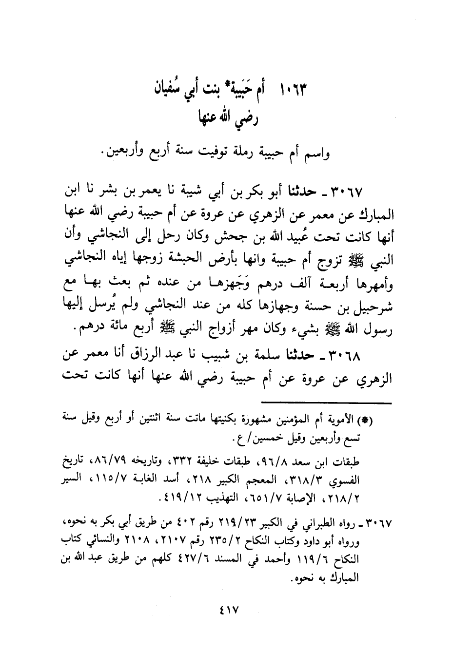 3067 - حَدَّثَنَا أَبُو بَكْرِ بْنُ أَبِي شَيْبَةَ، نا يَعْمُرُ بْنُ بِشْرٍ، نا ابْنُ الْمُبَارَكِ، عَنْ مَعْمَرٍ، عَنِ الزُّهْرِيِّ، عَنْ عُرْوَةَ، عَنْ أُمِّ حَبِيبَةَ، رَضِيَ اللَّهُ عَنْهَا، أَنَّهَا كَانَتْ تَحْتَ عُبَيْدِ اللَّهِ بْنِ جَحْشٍ وَكَانَ رَحَلَ إِلَى النَّجَاشِيِّ، وَأَنَّ النَّبِيَّ صَلَّى اللهُ عَلَيْهِ وَسَلَّمَ §تَزَوَّجَ أُمَّ حَبِيبَةَ وَأَنَّهَا بِأَرْضِ الْحَبَشَةِ زَوَّجَهَا إِيَّاهُ النَّجَاشِيُّ، وَأَمْهَرَهَا أَرْبَعَةَ أَلْفِ دِرْهَمٍ، وَجَهَّزَهَا مِنْ عِنْدِهِ ثُمَّ بَعَثَ بِهَا مَعَ شُرَحْبِيلَ ابْنِ حَسَنَةَ وَجِهَازُهَا كُلُّهُ مِنْ عِنْدِ النَّجَاشِيِّ، وَلَمْ يُرْسِلْ إِلَيْهَا رَسُولُ اللَّهِ صَلَّى اللهُ عَلَيْهِ وَسَلَّمَ بِشَيْءٍ، وَكَانَ مَهْرُ أَزْوَاجِ النَّبِيِّ صَلَّى اللهُ عَلَيْهِ وَسَلَّمَ أَرْبَعَ مِائَةِ دِرْهَمٍ "