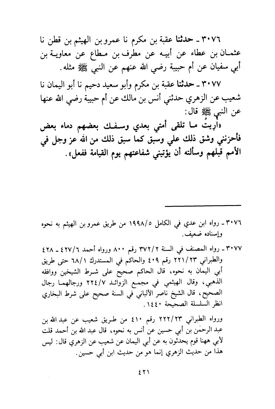 3077 - حَدَّثَنَا عُقْبَةُ بْنُ مُكْرَمٍ، وَأَبُو سَعِيدٍ دُحَيْمٌ، نا أَبُو الْيَمَانِ، نا شُعَيْبٌ، عَنِ الزُّهْرِيِّ، حَدَّثَنِي أَنَسُ بْنُ مَالِكٍ، عَنْ أُمِّ حَبِيبَةَ، رَضِيَ اللَّهُ عَنْهَا، عَنِ النَّبِيِّ صَلَّى اللهُ عَلَيْهِ وَسَلَّمَ قَالَ: «§أُرِيتُ مَا تَلْقَى أُمَّتِي بَعْدِي وَسَفْكَ بَعْضِهِمْ دِمَاءَ بَعْضٍ فَأَحْزَنَنِي وَشَقَّ ذَلِكَ عَلَيَّ وَسَبَقَ كَمَا سَبَقَ ذَلِكَ مِنَ اللَّهِ عَزَّ وَجَلَّ فِي الْأُمَمِ قَبْلَهُمْ وَسَأَلْتُهُ أَنْ يُؤْتِيَنِي شَفَاعَتَهُمْ يَوْمَ الْقِيَامَةِ فَفَعَلَ»