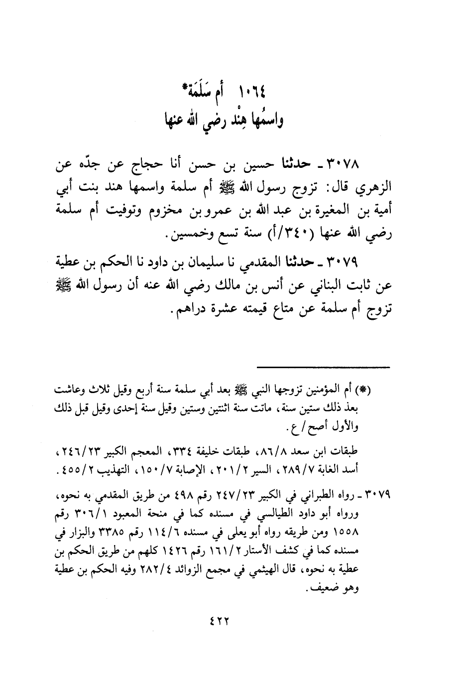 3078 - حَدَّثَنَا حُسَيْنُ بْنُ حَسَنٍ، أنا حَجَّاجٌ، عَنْ جَدِّهِ، عَنِ الزُّهْرِيِّ، قَالَ: §تَزَوَّجَ رَسُولُ اللَّهِ صَلَّى اللهُ عَلَيْهِ وَسَلَّمَ أُمَّ سَلَمَةَ وَاسْمُهَا هِنْدُ بِنْتُ أَبِي أُمَيَّةَ بْنِ الْمُغِيرَةِ بْنِ عَبْدِ اللَّهِ بْنِ عَمْرِو بْنِ مَخْزُومٍ، وَتُوُفِّيَتْ أُمُّ سَلَمَةَ رَضِيَ اللَّهُ عَنْهَا سَنَةَ تِسْعٍ وَخَمْسِينَ "