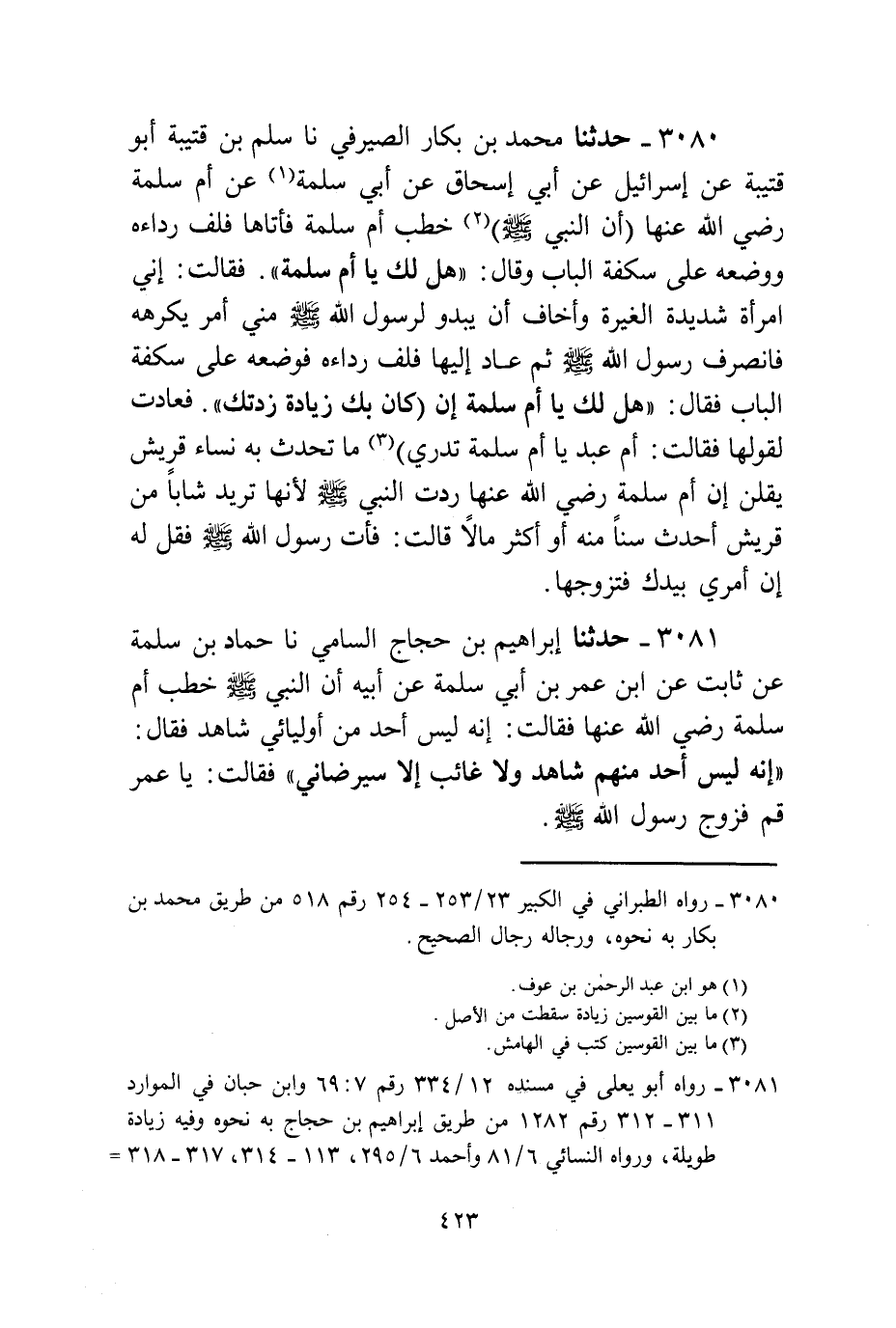 3080 - حَدَّثَنَا مُحَمَّدُ بْنُ بَكَّارٍ الصَّيْرَفِيُّ، نا سَلْمُ بْنُ قُتَيْبَةَ أَبُو قُتَيْبَةَ، عَنْ إِسْرَائِيلَ، عَنْ أَبِي إِسْحَاقَ، عَنْ أَبِي سَلَمَةَ، عَنْ أُمِّ سَلَمَةَ، رَضِيَ اللَّهُ عَنْهَا أَنَّ النَّبِيَّ صَلَّى اللهُ عَلَيْهِ وَسَلَّمَ خَطَبَ أُمَّ سَلَمَةَ فَأَتَاهَا فَلَفَّ رِدَاءَهُ وَوَضَعَهُ عَلَى أُسْكُفَّةِ الْبَابِ وَقَالَ: «هَلْ لَكِ يَا أُمَّ سَلَمَةَ؟» فَقَالَتْ: إِنِّي امْرَأَةٌ شَدِيدَةُ الْغَيْرَةِ وَأَخَافُ أَنْ يَبْدُوَ لِرَسُولِ اللَّهِ صَلَّى اللهُ عَلَيْهِ وَسَلَّمَ مِنِّي أَمْرٌ يَكْرَهُهُ فَانْصَرَفَ رَسُولُ اللَّهِ صَلَّى اللهُ عَلَيْهِ وَسَلَّمَ ثُمَّ عَادَ إِلَيْهَا فَلَفَّ رِدَاءَهُ فَوَضَعَهُ عَلَى أُسْكُفَّةِ الْبَابِ فَقَالَ: «§هَلْ لَكِ يَا أُمَّ سَلَمَةَ؟ إِنْ كَانَ بِكِ زِيَادَةٌ زِدْتُكِ» فَعَادَتْ لِقَوْلِهَا فَقَالَتْ أُمُّ عَبْدٍ: يَا أُمَّ سَلَمَةَ، تَدْرِي مَا تُحَدِّثُ بِهِ نِسَاءُ قُرَيْشٍ؟ يَقُلْنَ: إِنَّ أُمَّ سَلَمَةَ رَضِيَ اللَّهُ عَنْهَا رَدَّتِ النَّبِيَّ صَلَّى اللهُ عَلَيْهِ وَسَلَّمَ لِأَنَّهَا تُرِيدُ شَابًّا مِنْ قُرَيْشٍ أَحْدَثَ سِنًّا مِنْهُ أَوْ أَكْثَرَ مَالًا. قَالَتْ: فَأْتِ رَسُولَ اللَّهِ صَلَّى اللهُ عَلَيْهِ وَسَلَّمَ فَقُلْ لَهُ إِنَّ أَمْرِي بِيَدِكَ فَتَزَوَّجَهَا
