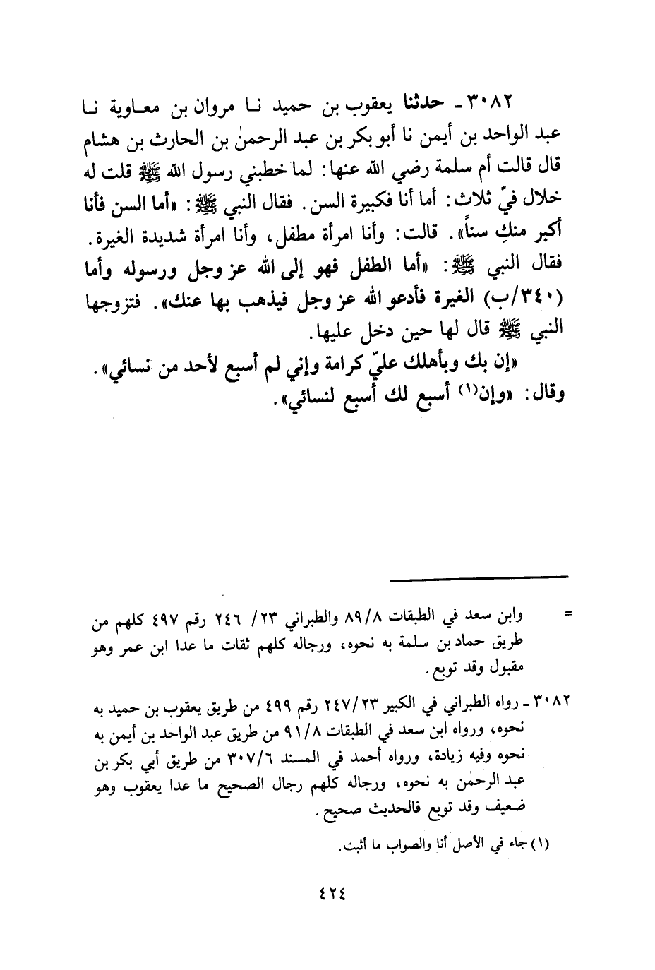 3082 - حَدَّثَنَا يَعْقُوبُ بْنُ حُمَيْدٍ، نا مَرْوَانُ بْنُ مُعَاوِيَةَ، نا عَبْدُ الْوَاحِدِ بْنُ أَيْمَنَ، نا أَبُو بَكْرِ بْنُ عَبْدِ الرَّحْمَنِ بْنِ الْحَارِثِ بْنِ هِشَامٍ، قَالَ: قَالَتْ أُمُّ سَلَمَةَ رَضِيَ اللَّهُ عَنْهَا: §لَمَّا خَطَبَنِي رَسُولُ اللَّهِ صَلَّى اللهُ عَلَيْهِ وَسَلَّمَ قُلْتُ لَهُ: خِلَالٌ فِيَّ ثَلَاثٌ: أَمَّا أَنَا فَكَبِيرَةُ السِّنَّ. فَقَالَ النَّبِيُّ صَلَّى اللهُ عَلَيْهِ وَسَلَّمَ: «أَمَّا السِّنُّ فَأَنَا أَكْبَرُ مِنْكَ سِنًّا» قَالَتْ: وَأَنَا امْرَأَةٌ مُطْفِلٌ وَأَنَا امْرَأَةٌ شَدِيدَةُ الْغَيْرَةِ. فَقَالَ النَّبِيُّ صَلَّى اللهُ عَلَيْهِ وَسَلَّمَ: «أَمَّا الطِّفْلُ فَهُوَ إِلَى اللَّهِ عَزَّ وَجَلَّ وَرَسُولِهِ وَأَمَّا الْغَيْرَةُ فَأَدْعُو اللَّهَ عَزَّ وَجَلَّ فَيَذْهَبْ بِهَا عَنْكَ» فَتَزَوَّجَهَا النَّبِيُّ صَلَّى اللهُ عَلَيْهِ وَسَلَّمَ قَالَ لَهَا حِينَ دَخَلَ عَلَيْهَا: «إِنَّ بِكِ وَبِأَهْلِكِ عَلَيَّ كَرَامَةً وَإِنِّي لَمْ أُسَبِّعْ لِأَحَدٍ مِنْ نِسَائِي» . وَقَالَ: «وَإِنْ أُسَبِّعْ لَكِ أُسَبِّعْ لِنِسَائِي» وَمِمَّا أَسْنَدَتْ