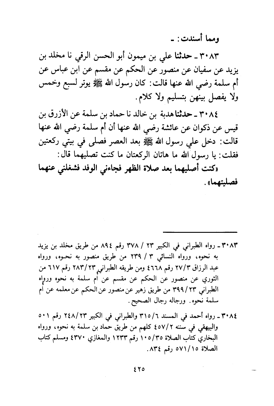 3083 - حَدَّثَنَا عَلِيُّ بْنُ مَيْمُونٍ أَبُو الْحَسَنِ الرَّقِّيُّ، نا مَخْلَدُ بْنُ يَزِيدَ، عَنْ سُفْيَانَ، عَنْ مَنْصُورٍ، عَنِ الْحَكَمِ، عَنْ مِقْسَمٍ، عَنِ ابْنِ عَبَّاسٍ، عَنْ أُمِّ سَلَمَةَ، رَضِيَ اللَّهُ عَنْهَا قَالَتْ: كَانَ رَسُولُ اللَّهِ صَلَّى اللهُ عَلَيْهِ وَسَلَّمَ §يُوتِرُ لِسَبْعٍ وَخَمْسٍ وَلَا يَفْصِلُ بَيْنَهُنَّ بِتَسْلِيمٍ وَلَا كَلَامٍ